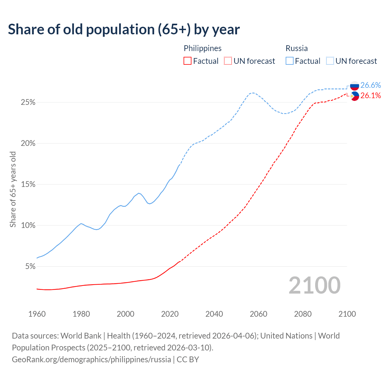The share of older people aged 65 and over is 5.49% in the Philippines and 17.2% in Russia. Life expectancy in the Philippines compared to Russia .