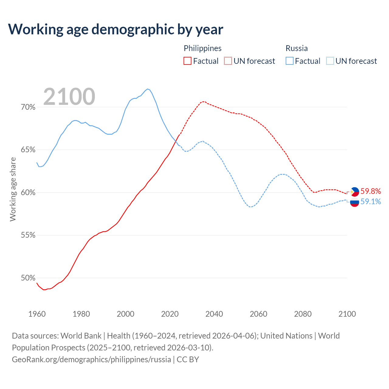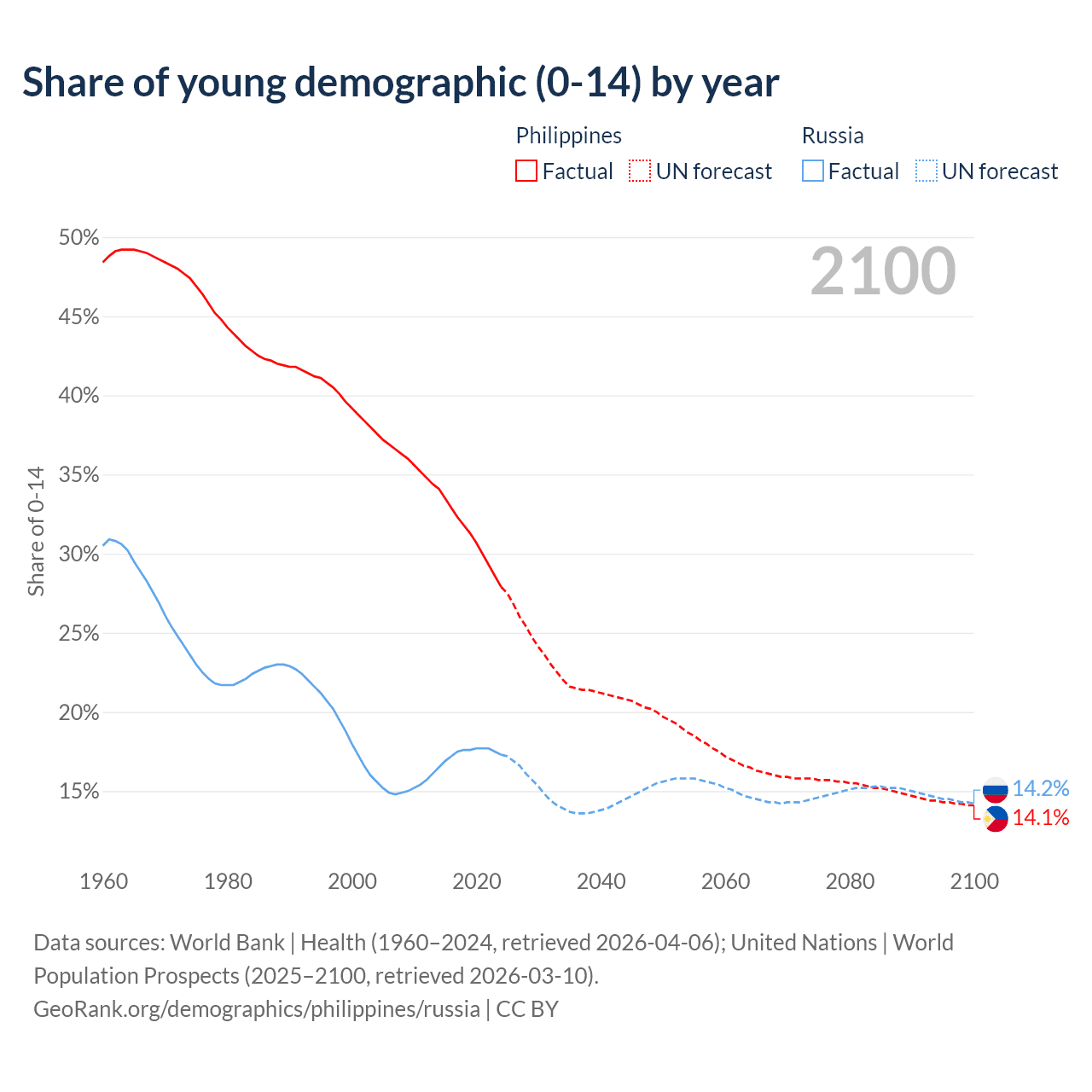 Median age Philippines vs Russia, 1960-2100