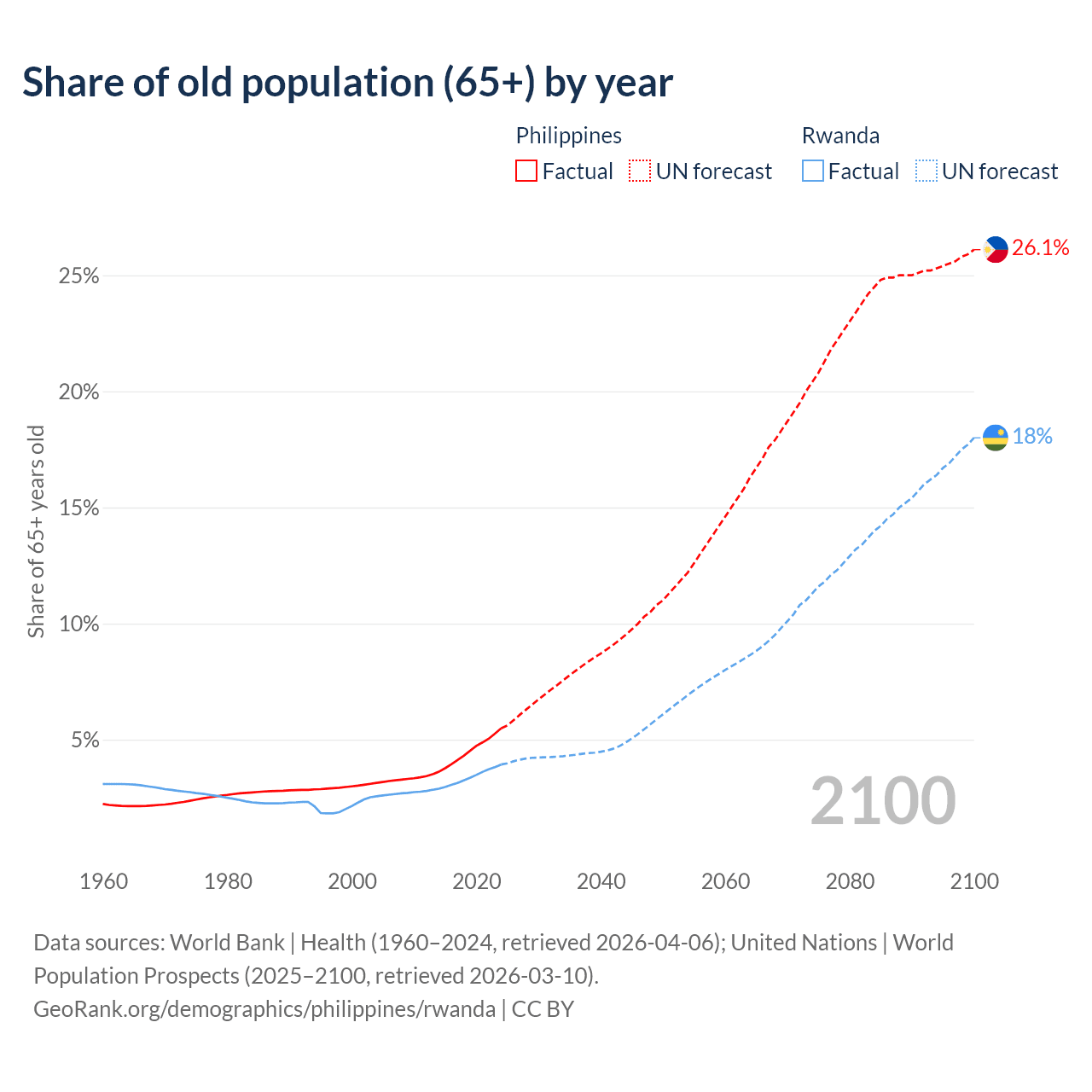 - The share of old-age demographic (65+) in the Philippines is 5.49% vs 3.93% in Rwanda.
