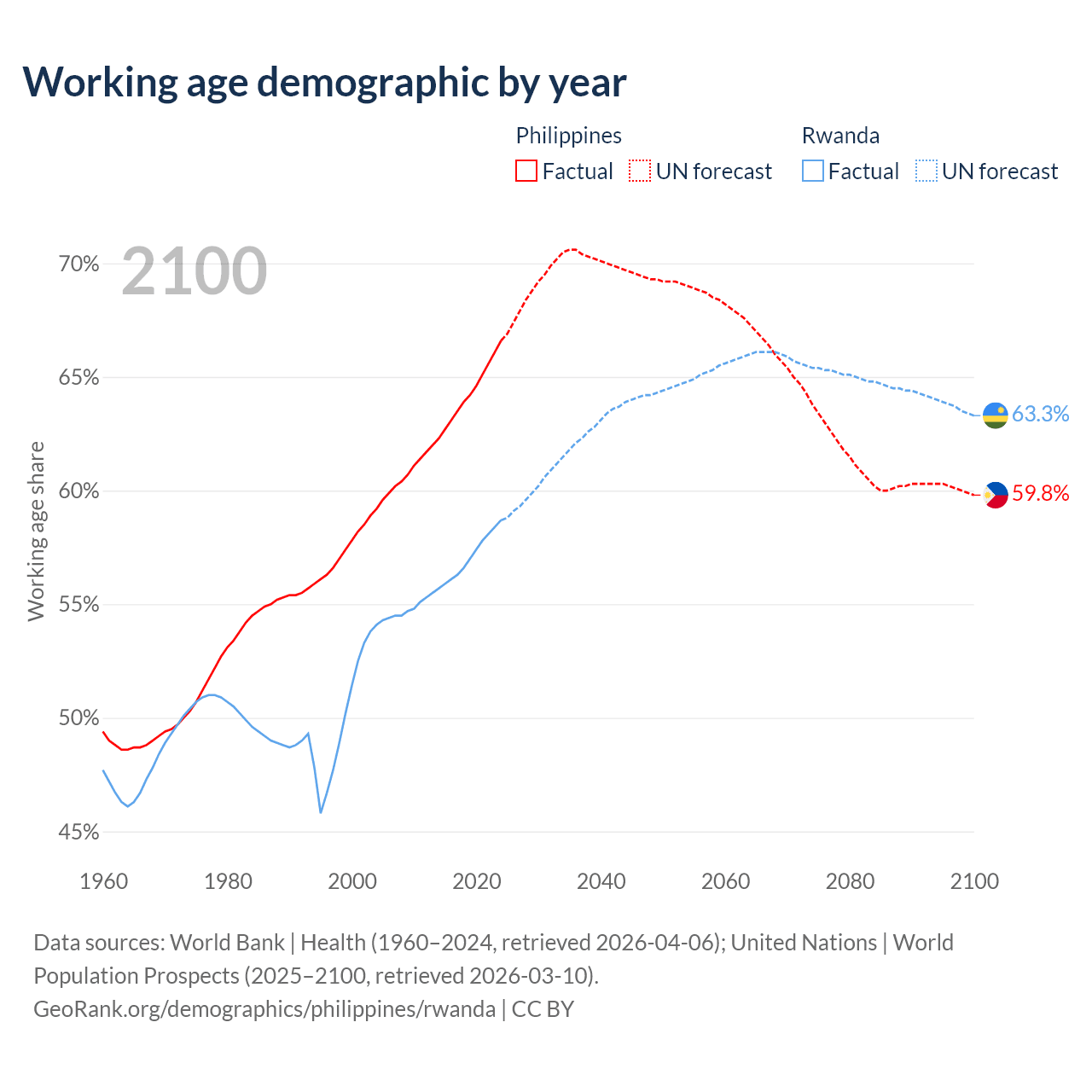 Median age Philippines vs Rwanda, 1960-2100