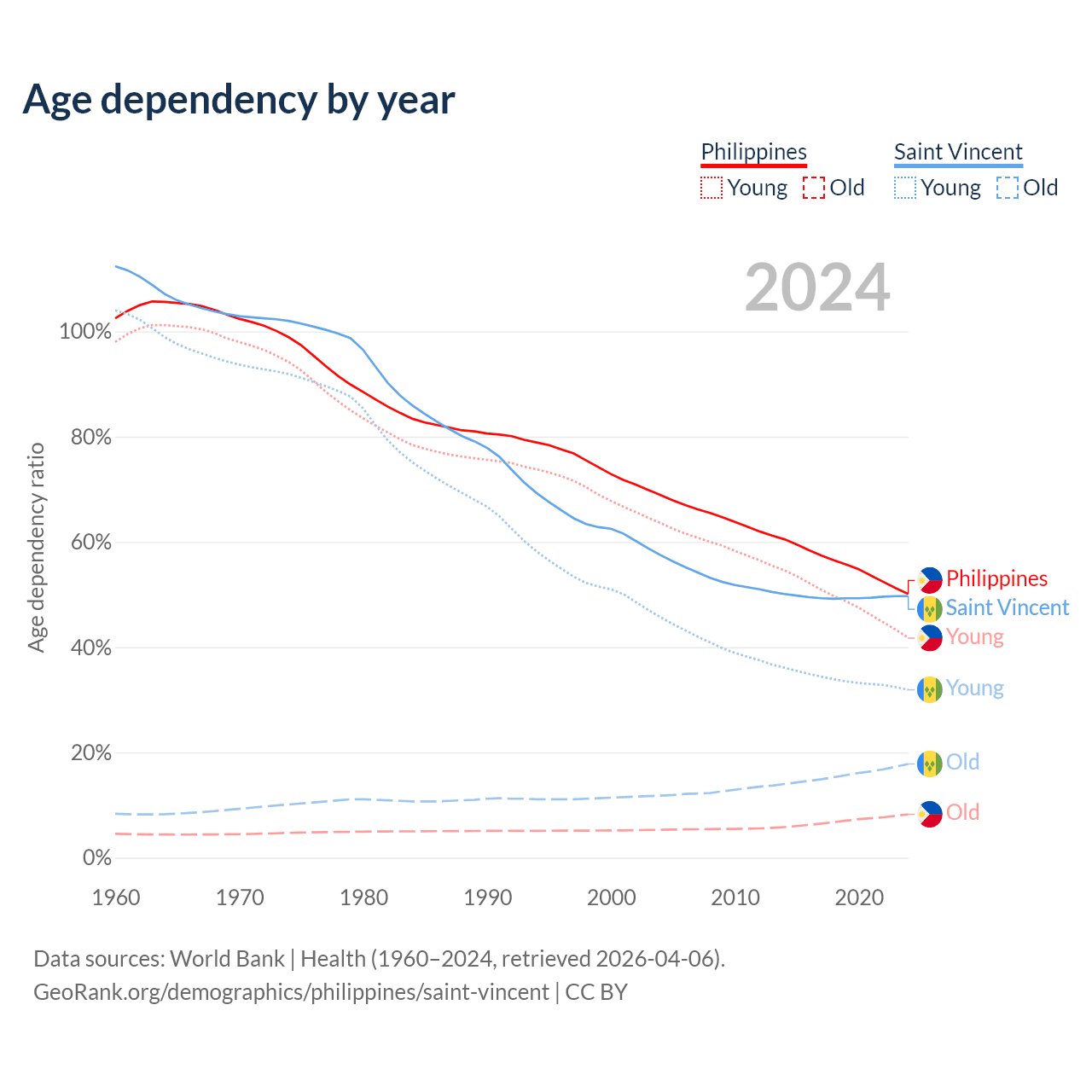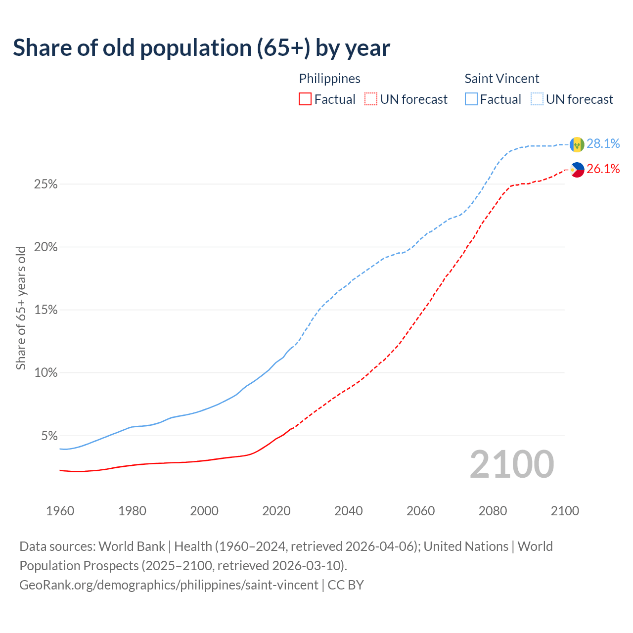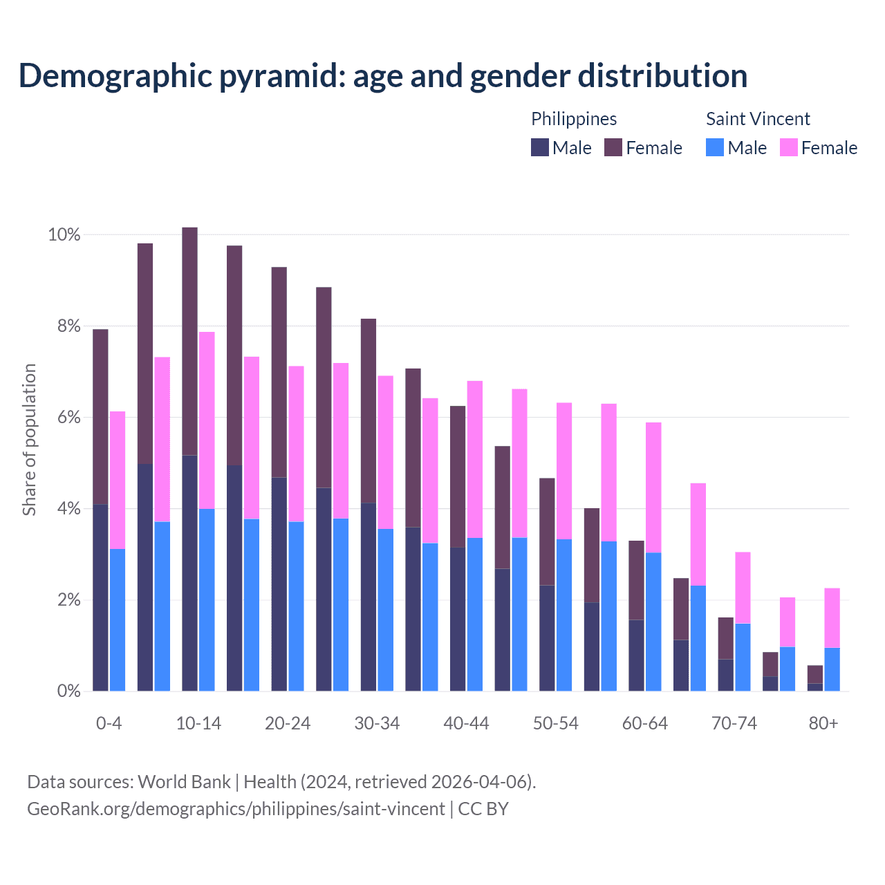 - The share of old-age demographic (65+) in the Philippines is 5.49% vs 11.9% in Saint Vincent.