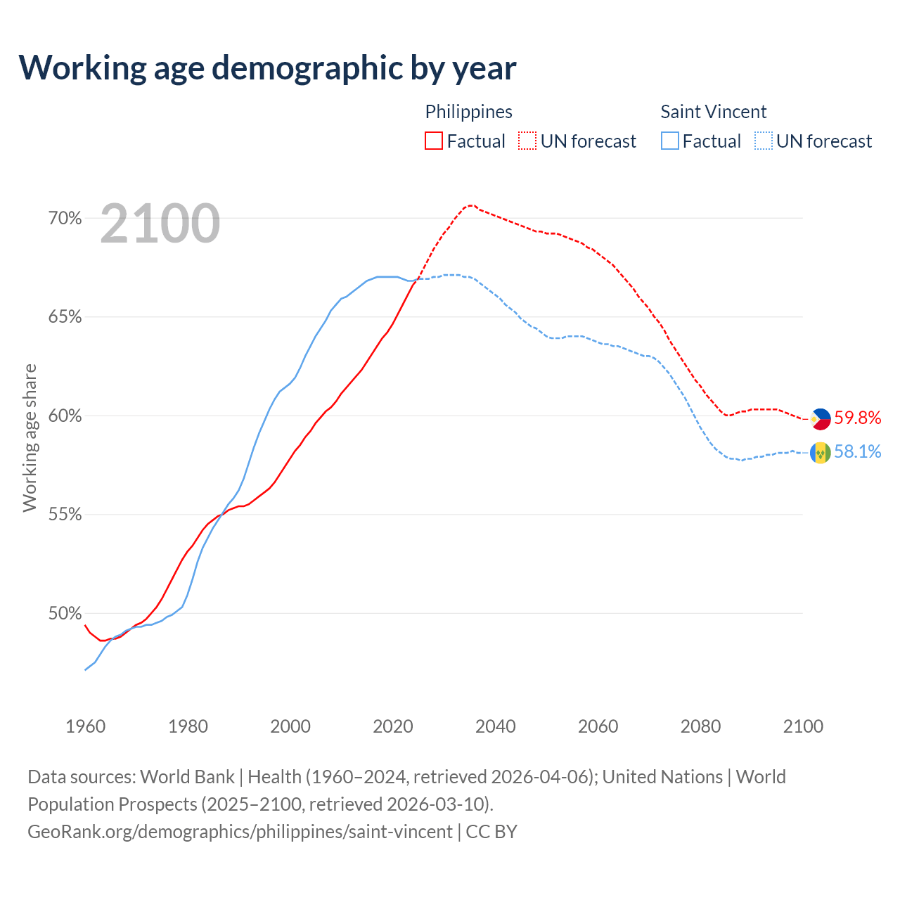 - The Philippines has 78.6M working age adults (aged 15-64) vs 66.3K in Saint Vincent.
