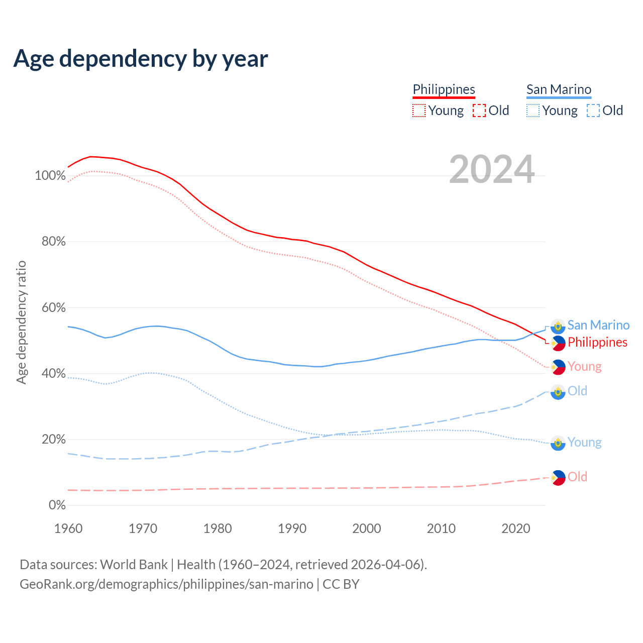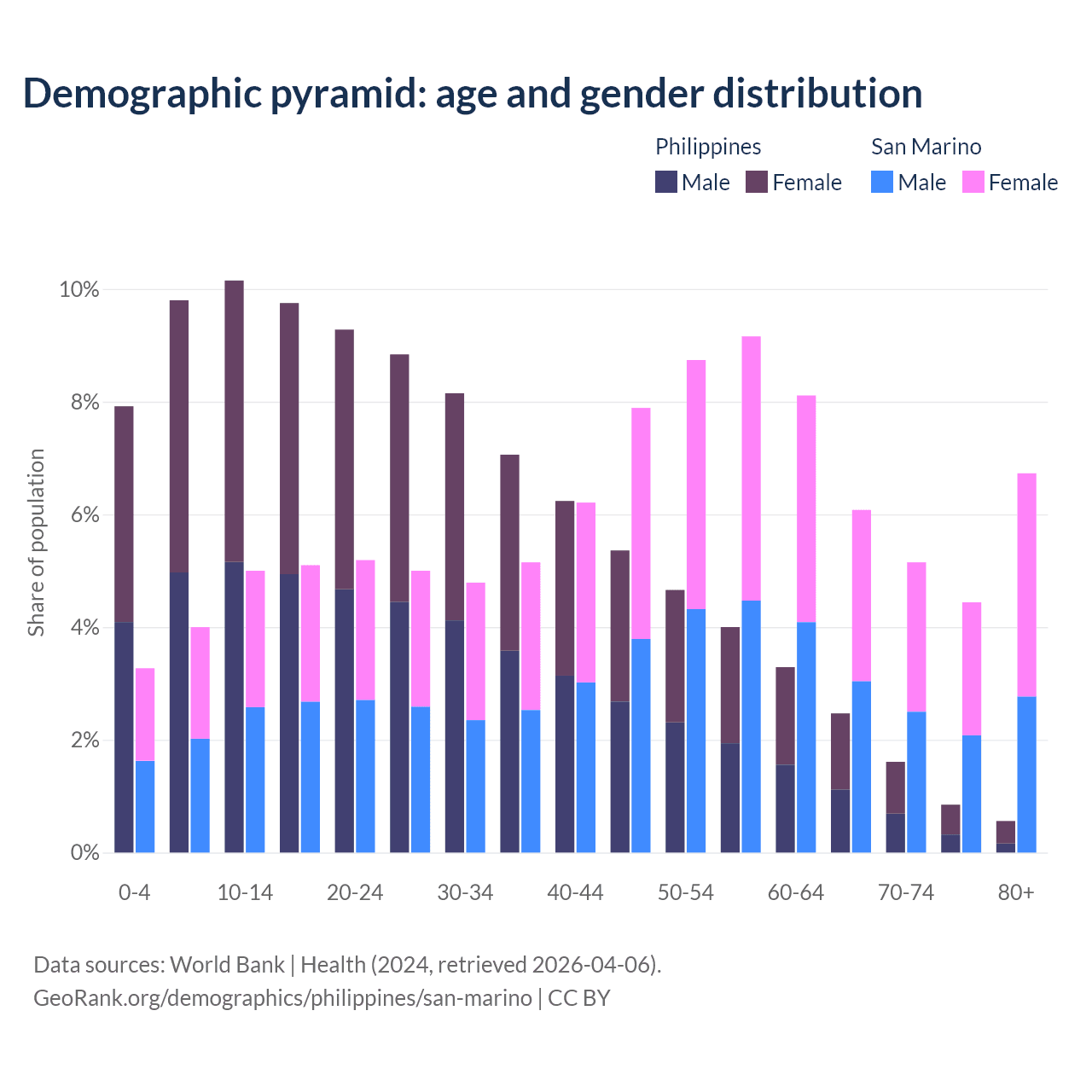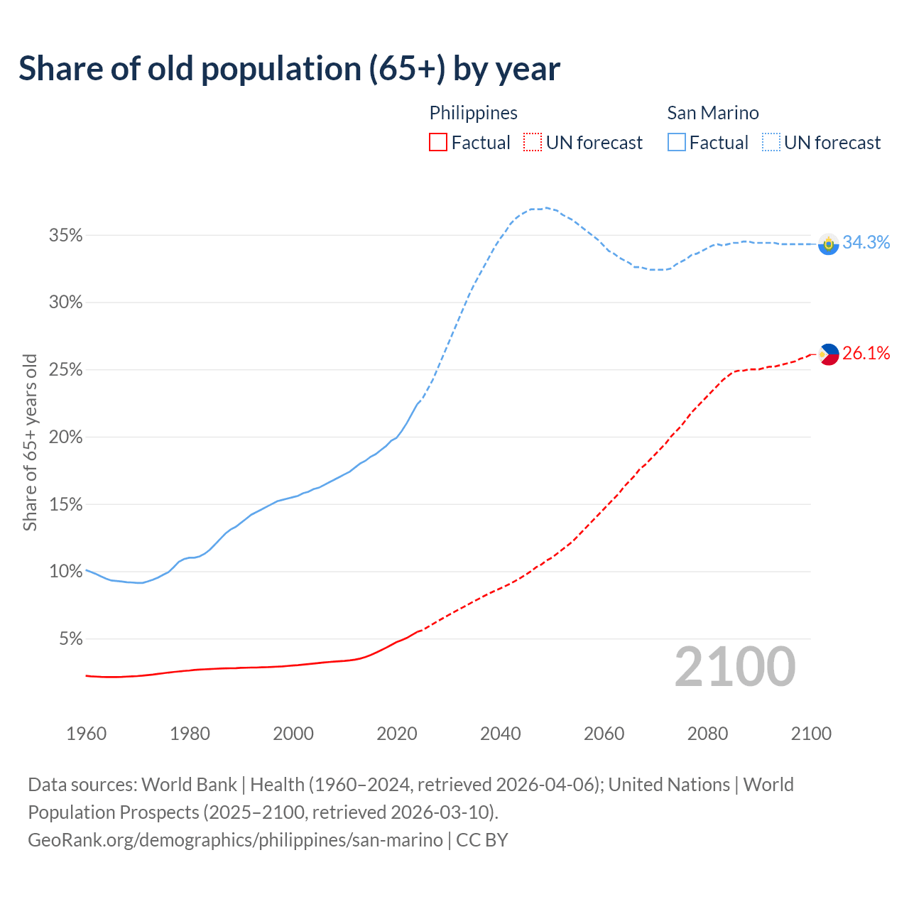 - The share of old-age demographic (65+) in the Philippines is 5.49% vs 22.4% in San Marino.