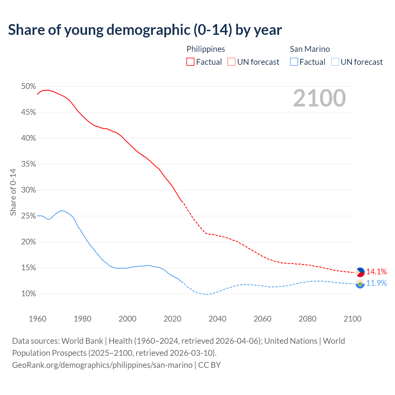 - The share of young demographic (0-15 years old) in the Philippines is 27.9% vs 12.3% in San Marino.