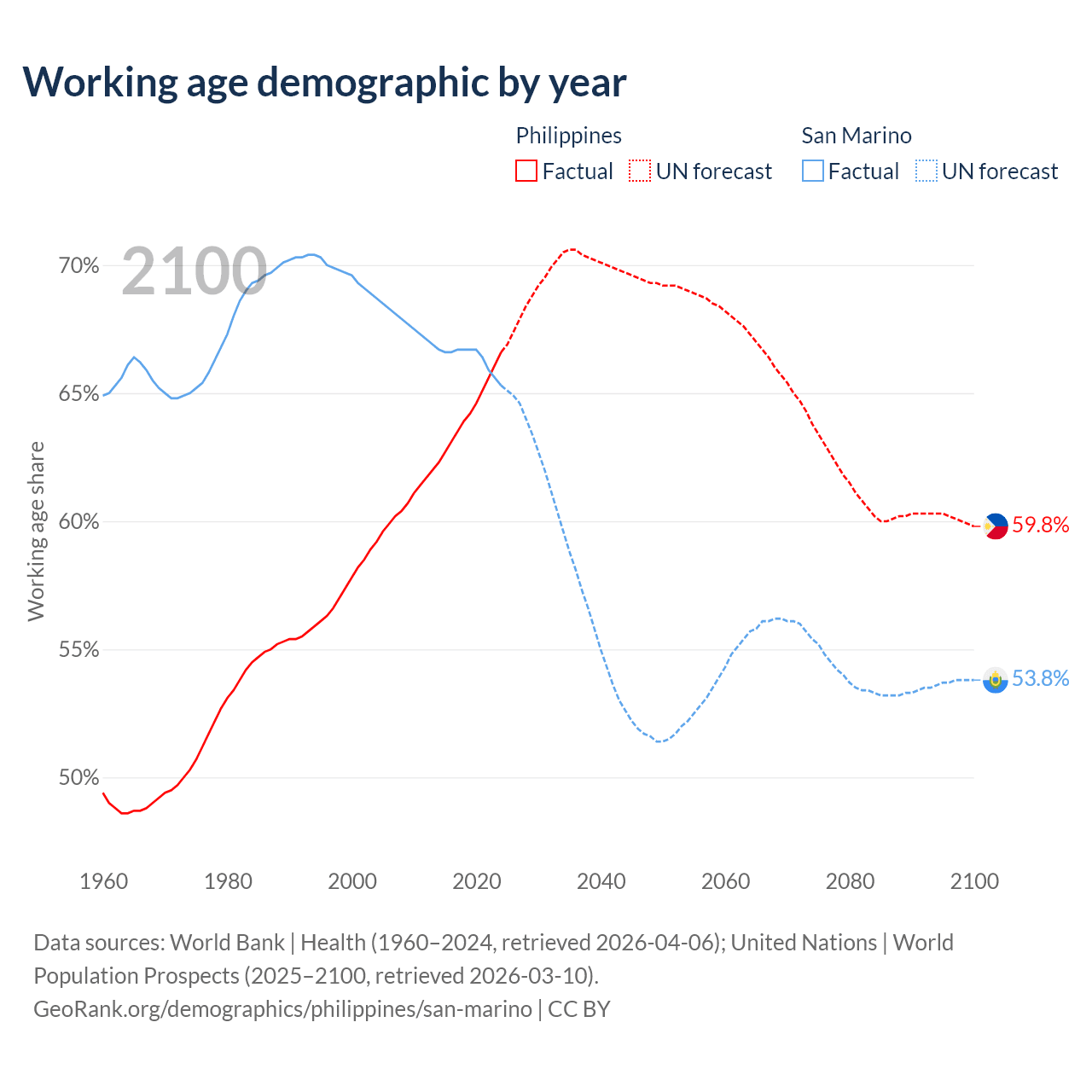 - The Philippines has 78.6M working age adults (aged 15-64) vs 22.2K in San Marino.