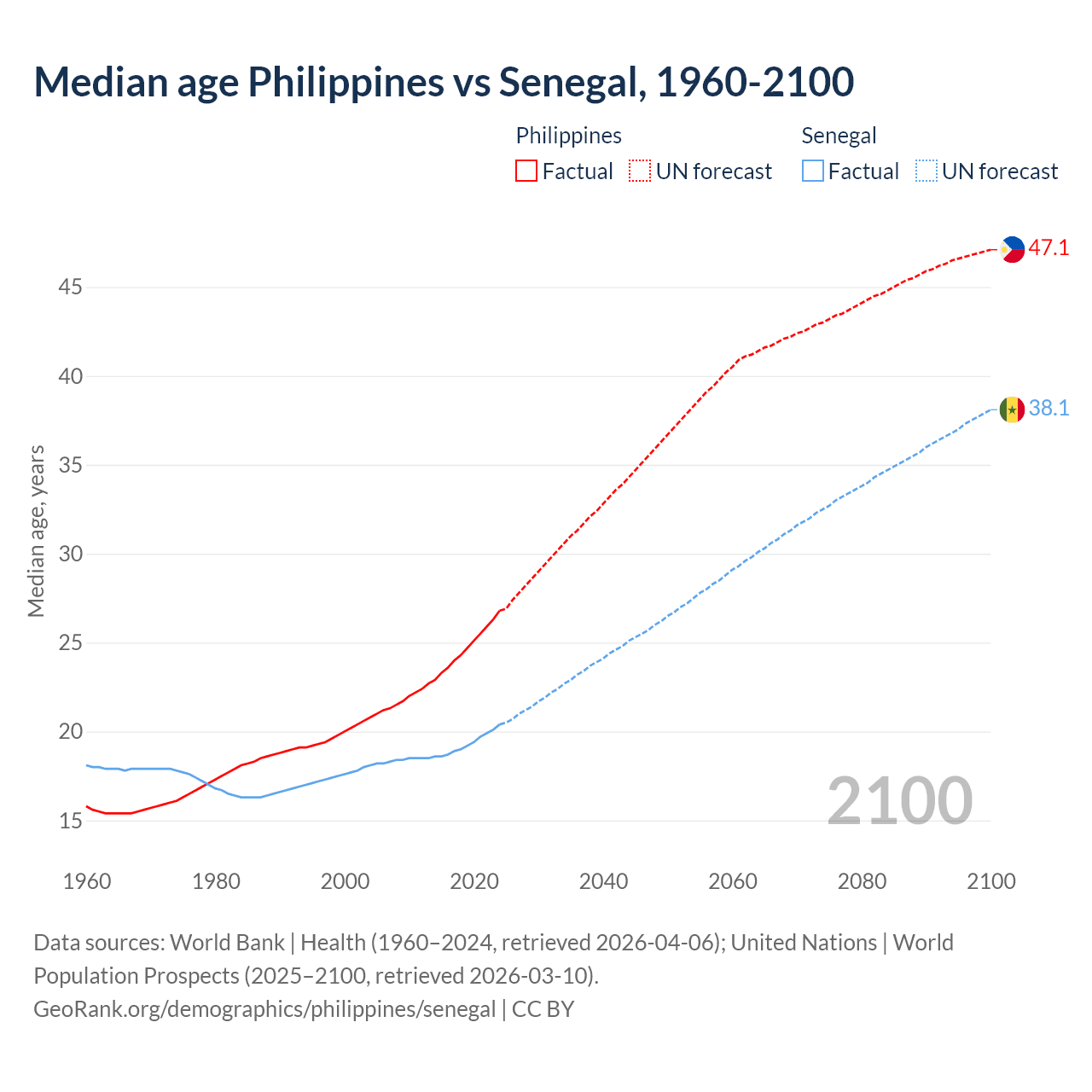 - The median age in the Philippines is 26.8 years compared to 20.4 years in Senegal.
