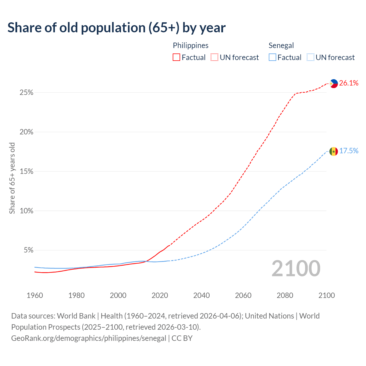 - The share of old-age demographic (65+) in the Philippines is 5.49% vs 3.62% in Senegal.
