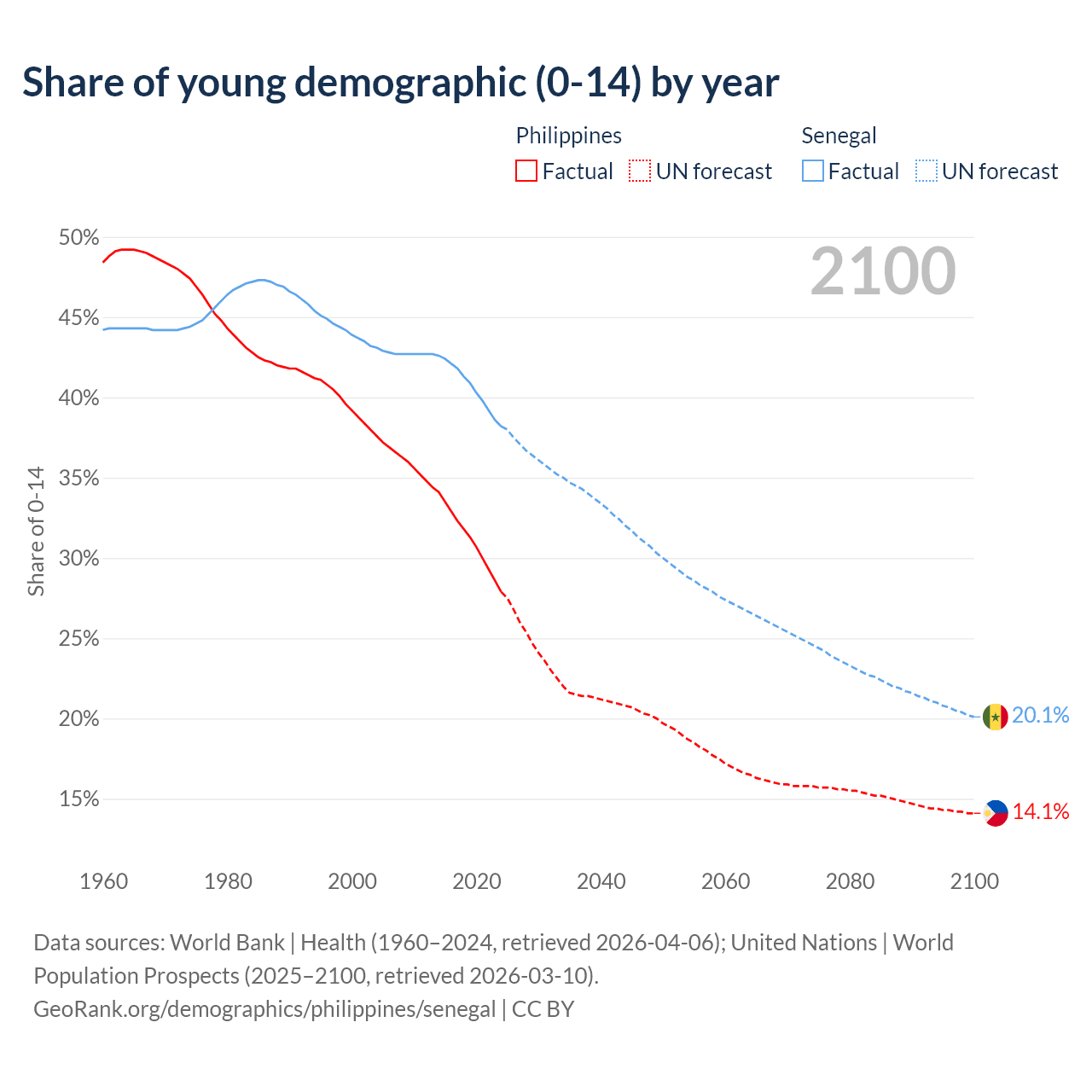 - The share of young demographic (0-15 years old) in the Philippines is 27.9% vs 38.2% in Senegal.