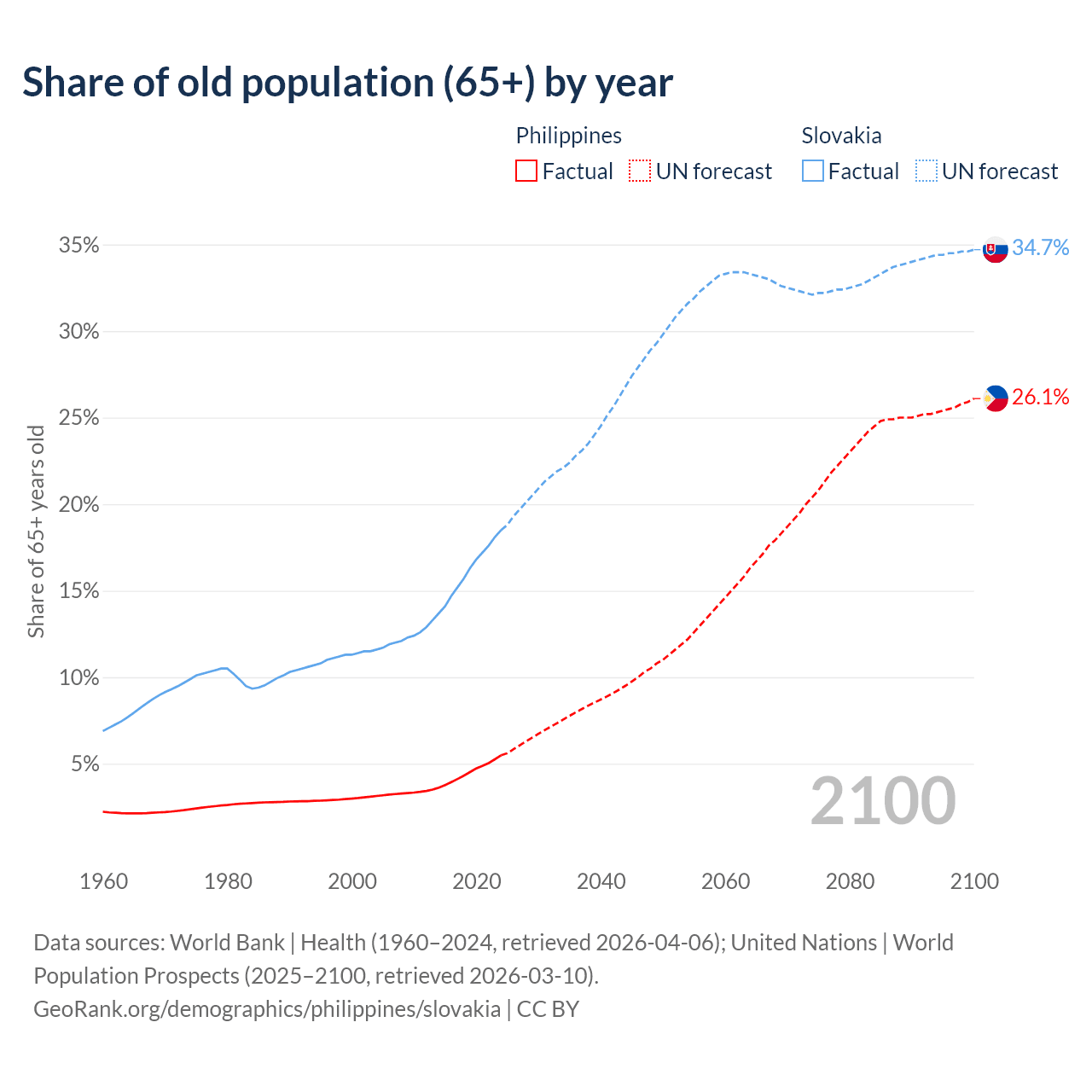 The share of older people aged 65 and over is 5.49% in the Philippines and 18.5% in Slovakia. Life expectancy in the Philippines compared to Slovakia .