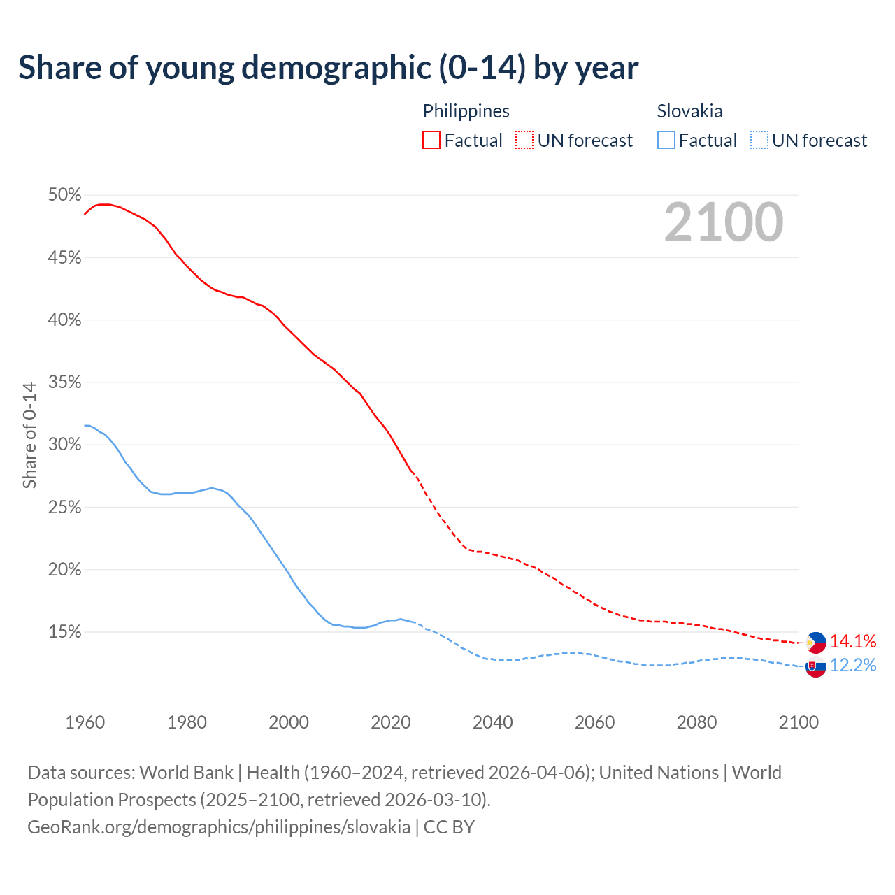 - The share of young demographic (0-15 years old) in the Philippines is 27.9% vs 15.8% in Slovakia.