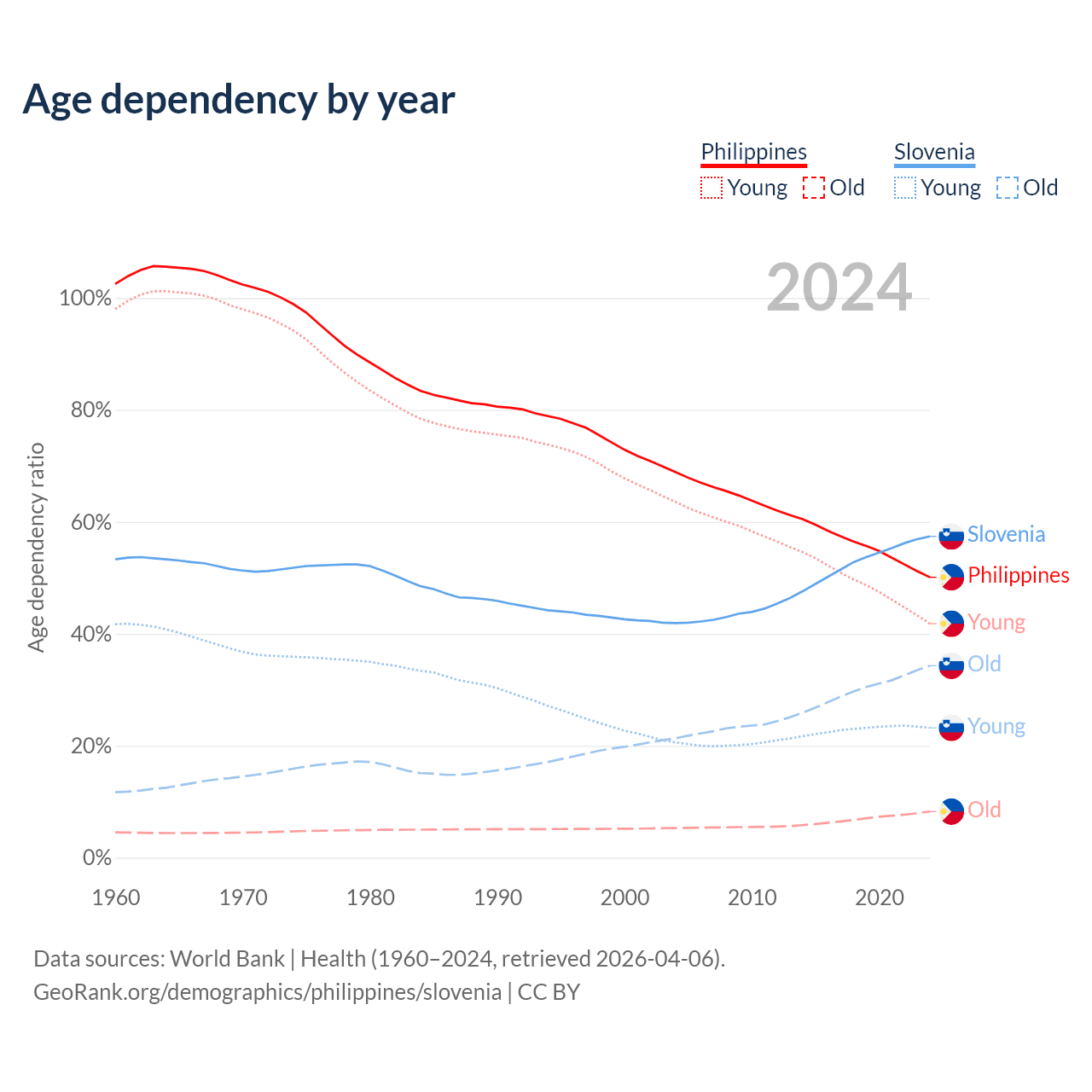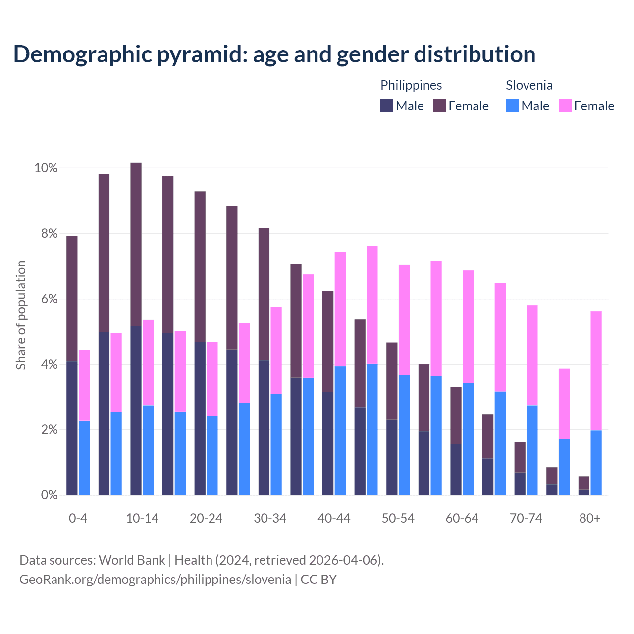 - The share of old-age demographic (65+) in the Philippines is 5.49% vs 21.8% in Slovenia.