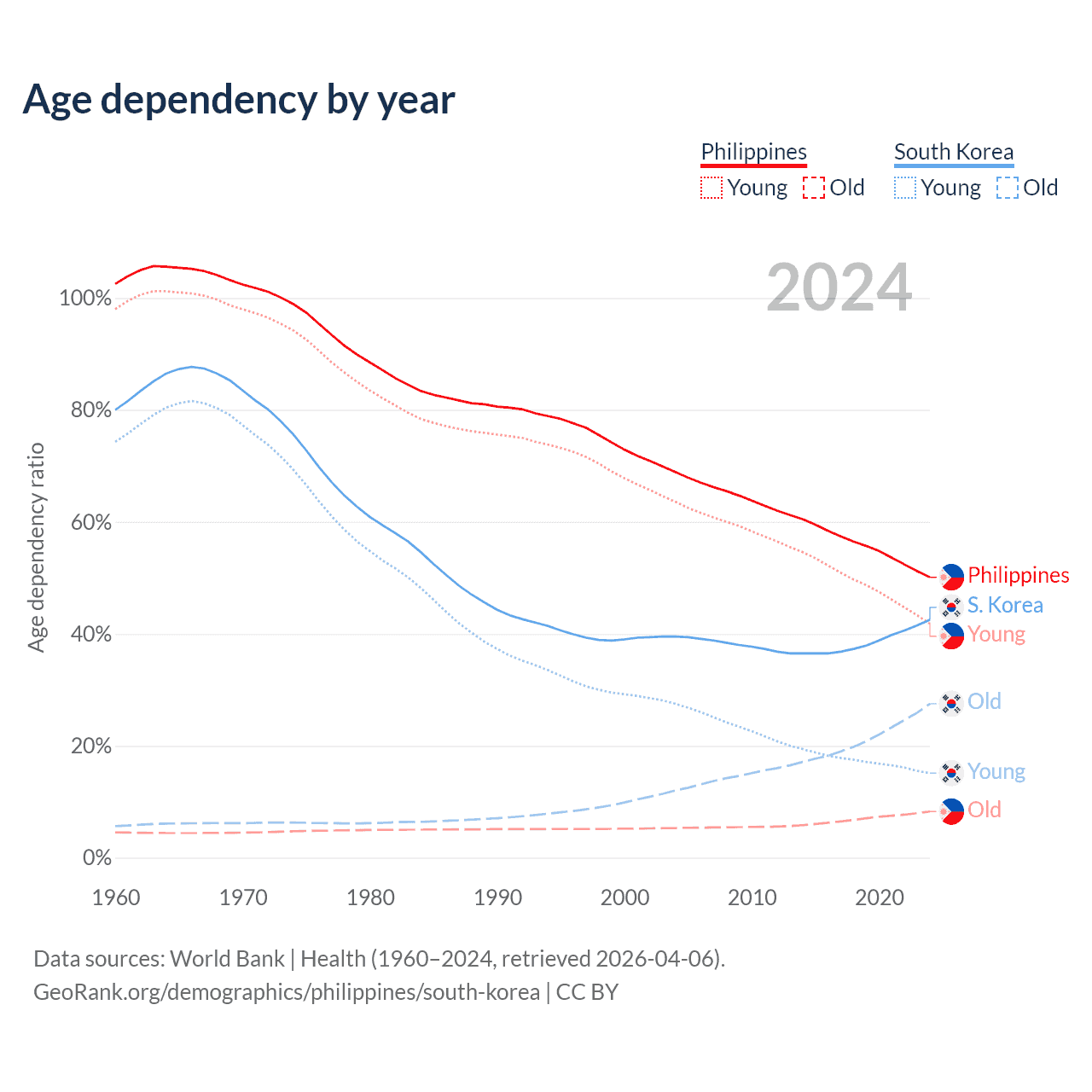 Data sources: World Bank | Health (1960–2024, retrieved 2026-04-06); U.S. Census Bureau (1960–2024, retrieved 2026-02-08).