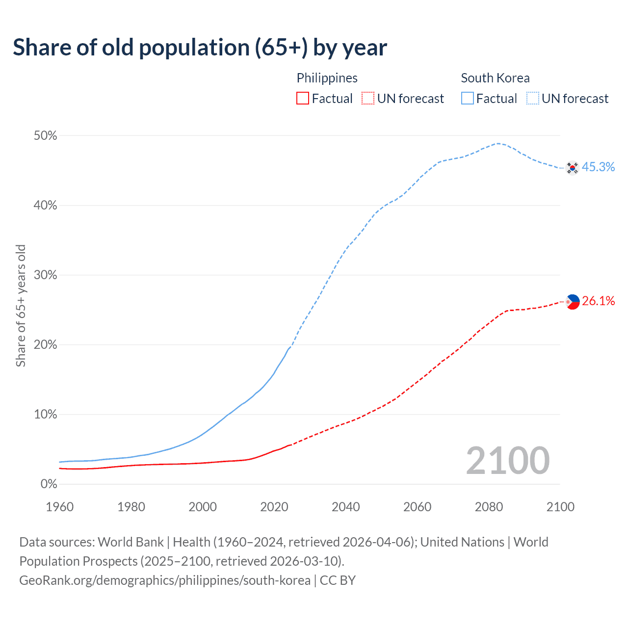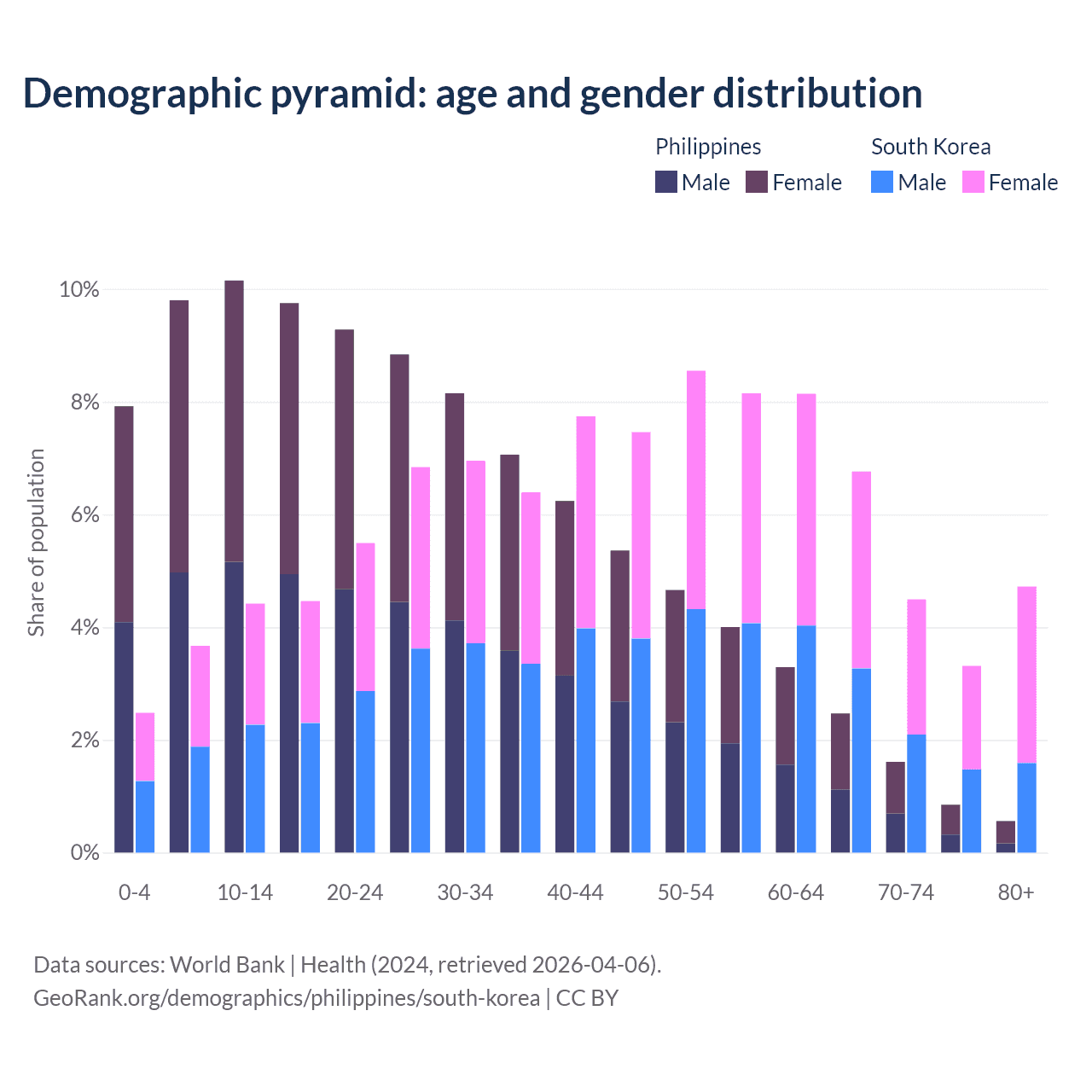 The share of older people aged 65 and over is 5.49% in the Philippines and 19.3% in South Korea. Life expectancy in the Philippines compared to South Korea .
