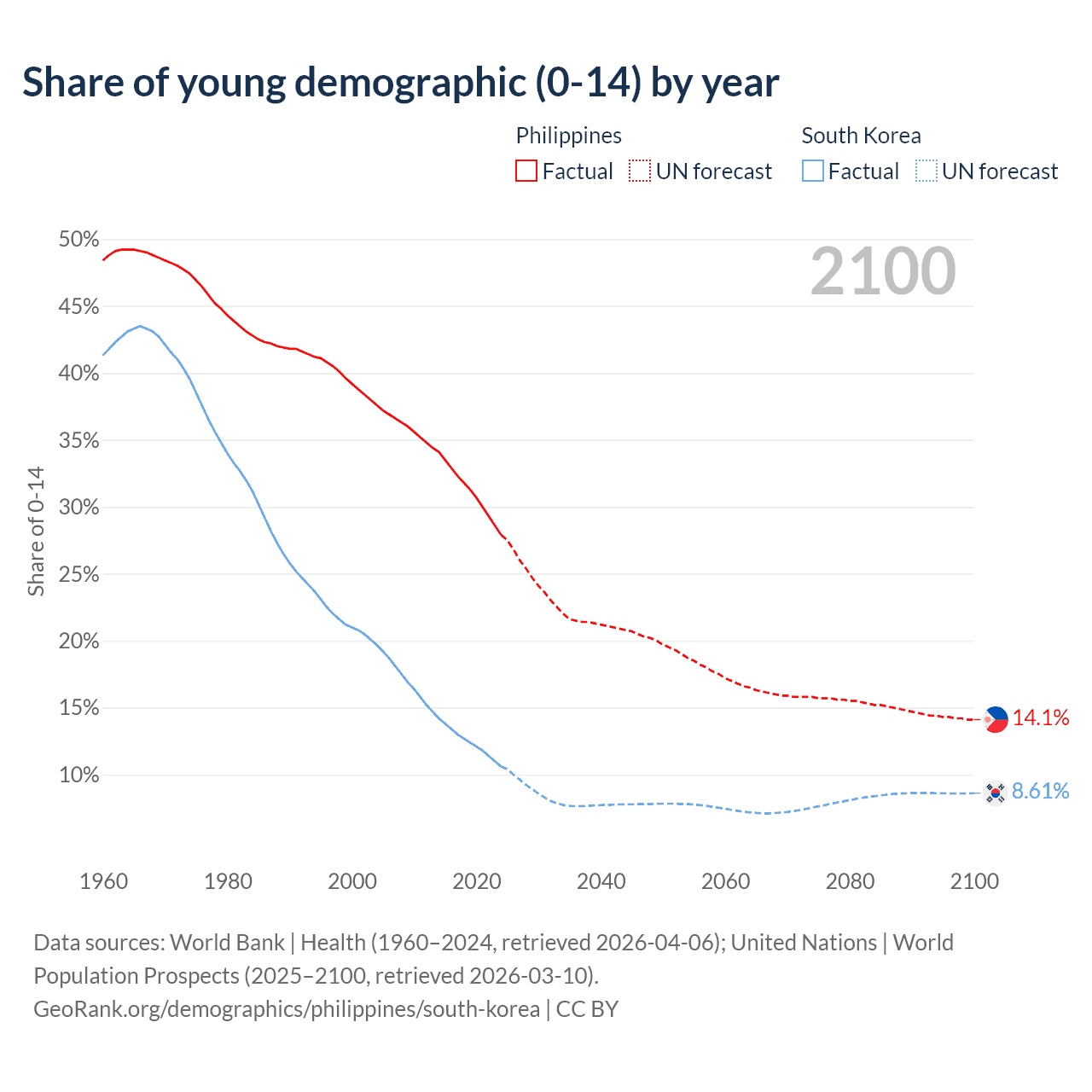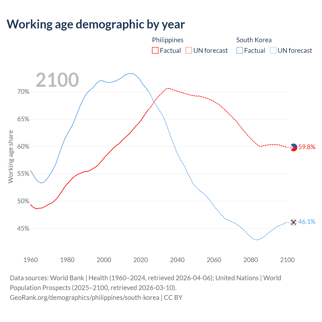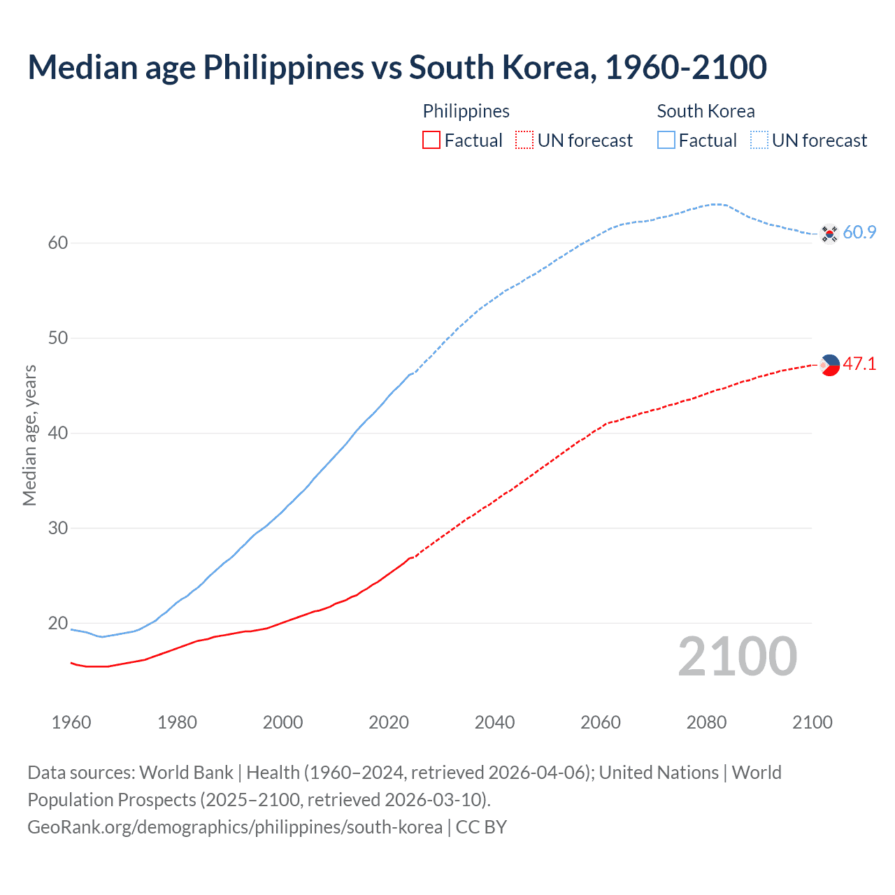 Median age Philippines vs South Korea, 1960-2100