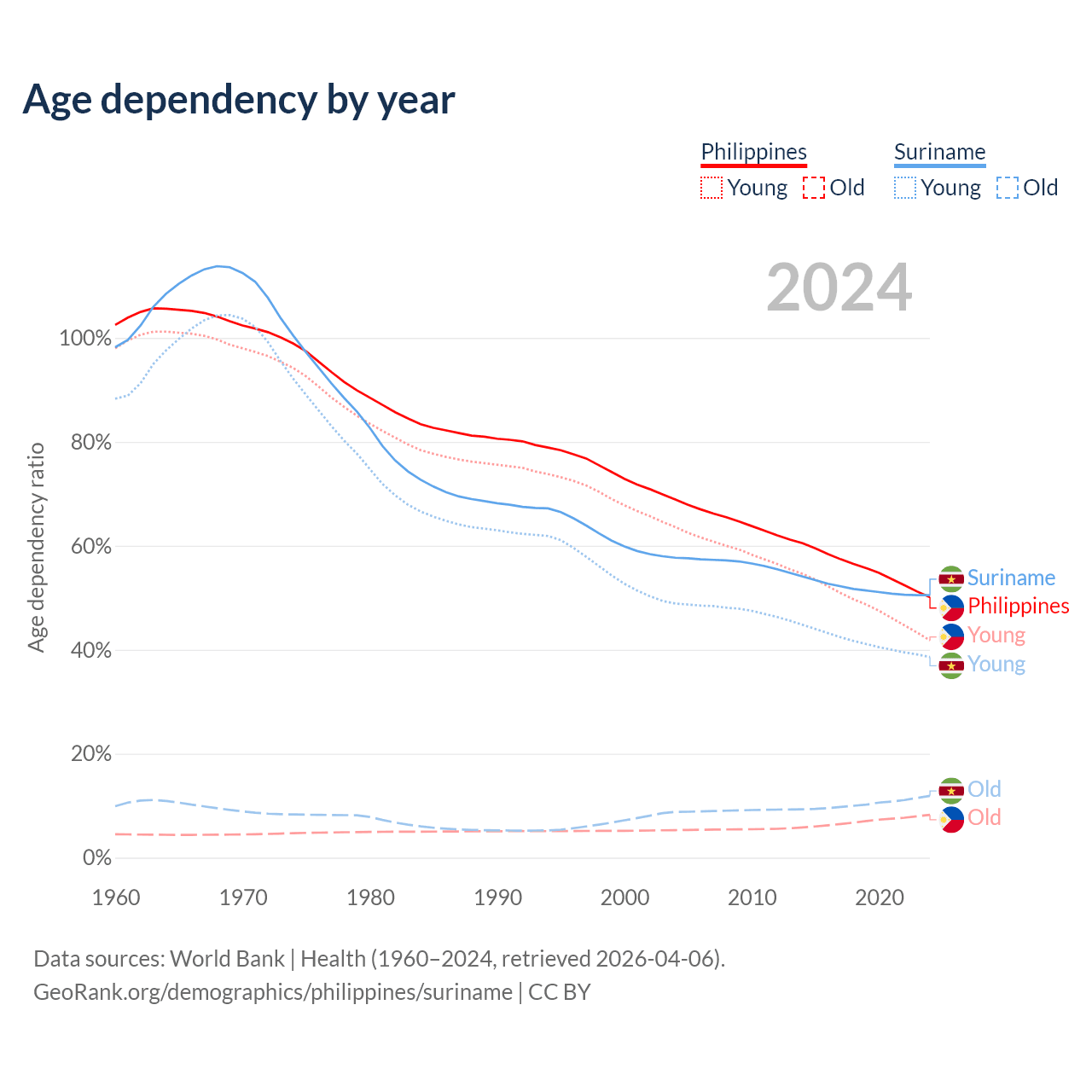 - The share of old-age demographic (65+) in the Philippines is 5.49% vs 7.9% in Suriname.