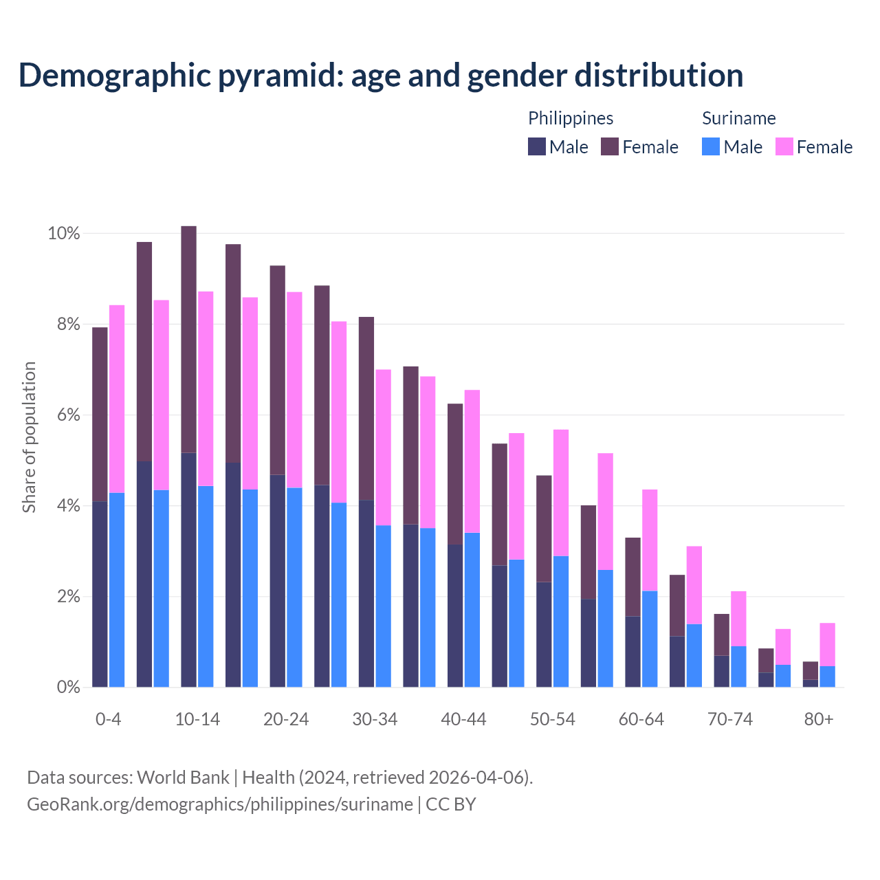 - The Philippines is ranked 123/196 by median age (oldest to youngest) vs 109/196 for Suriname.