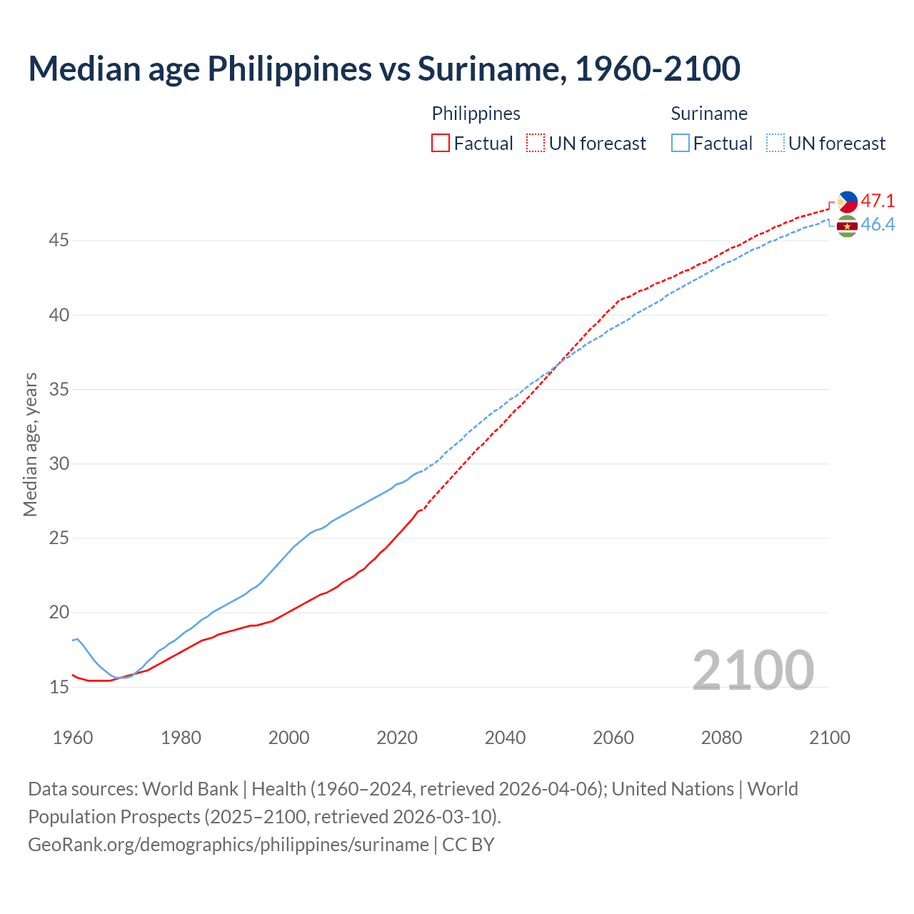 - The median age in the Philippines is 26.8 years compared to 29.4 years in Suriname.