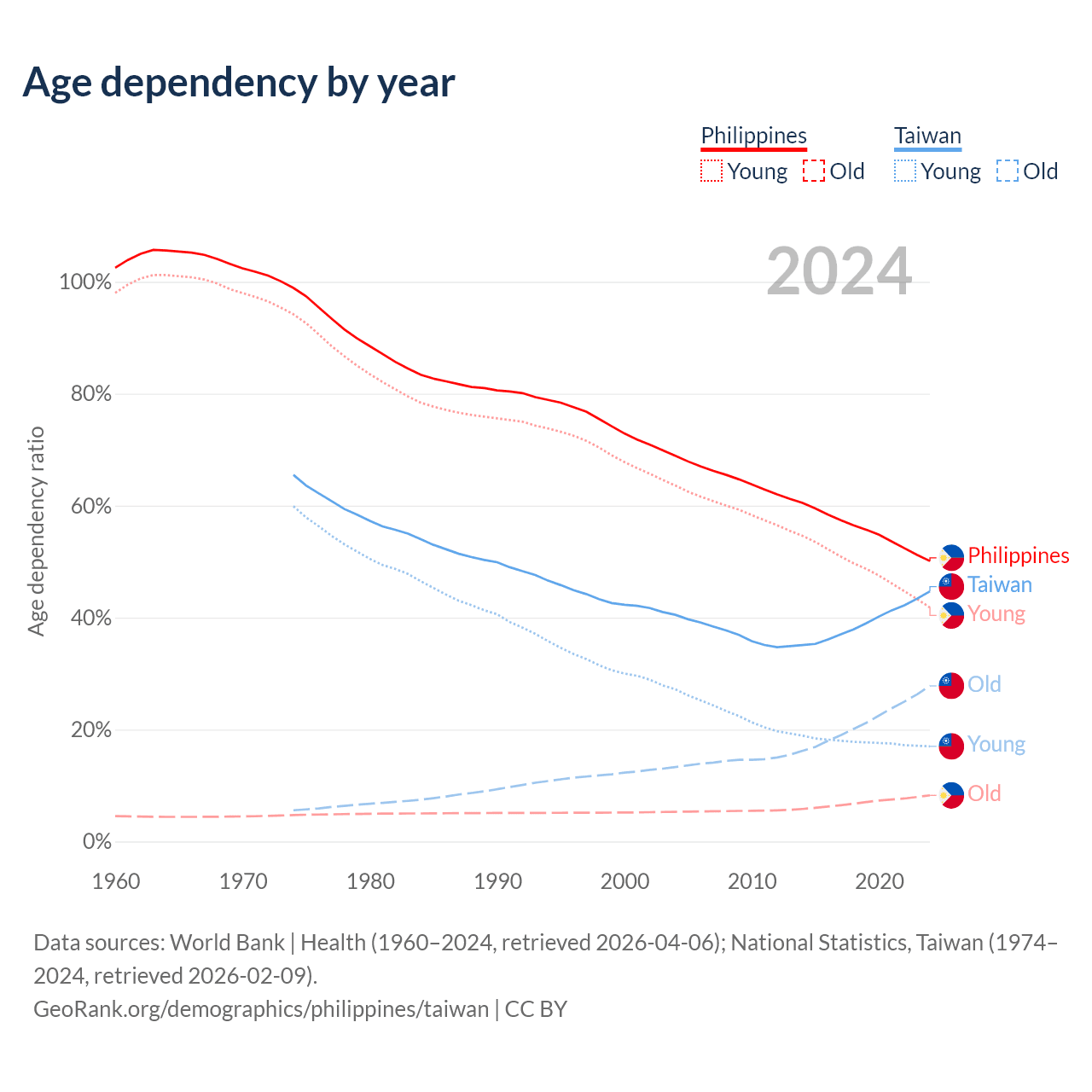 Data sources: World Bank | Health (1960–2024, retrieved 2026-04-06); U.S. Census Bureau (1960–2024, retrieved 2026-02-08); National Statistics, Taiwan (1974–2024, retrieved 2026-02-09).