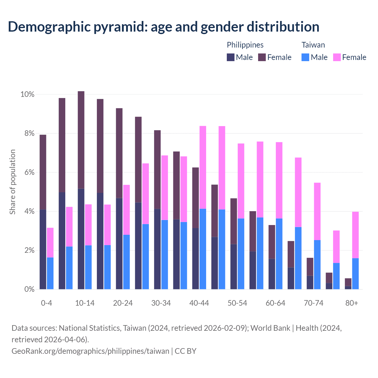 - The Philippines is ranked 123/196 by median age (oldest to youngest) vs 16/196 for Taiwan.