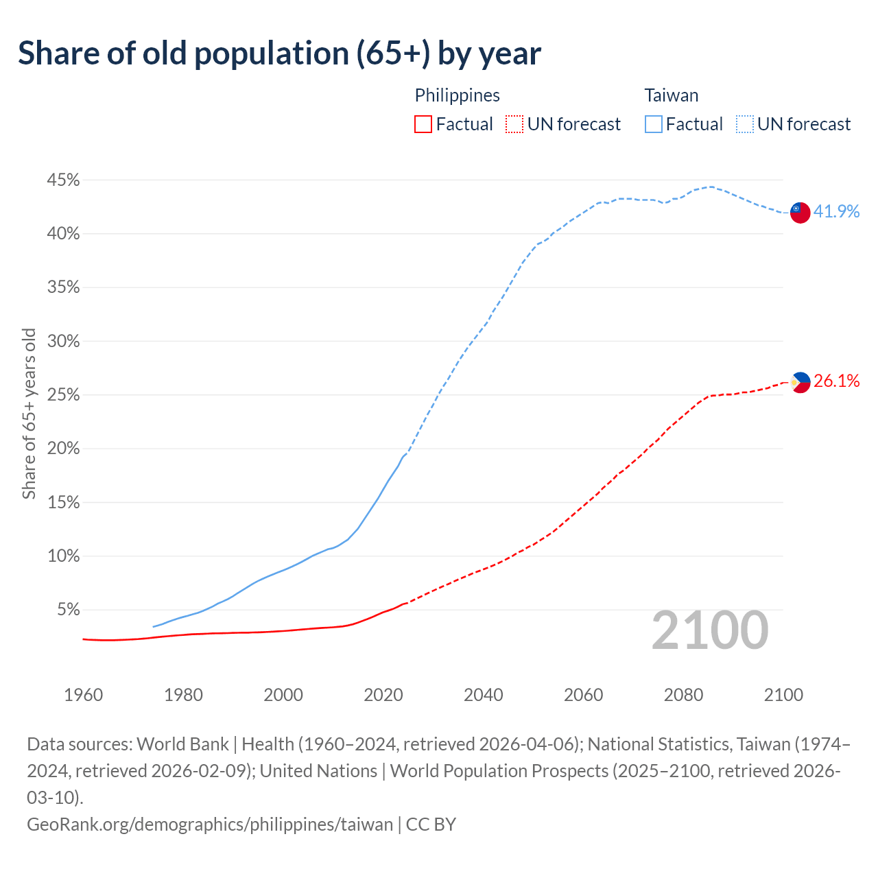 The share of older people aged 65 and over is 5.49% in the Philippines and 19.2% in Taiwan. Life expectancy in the Philippines compared to Taiwan .