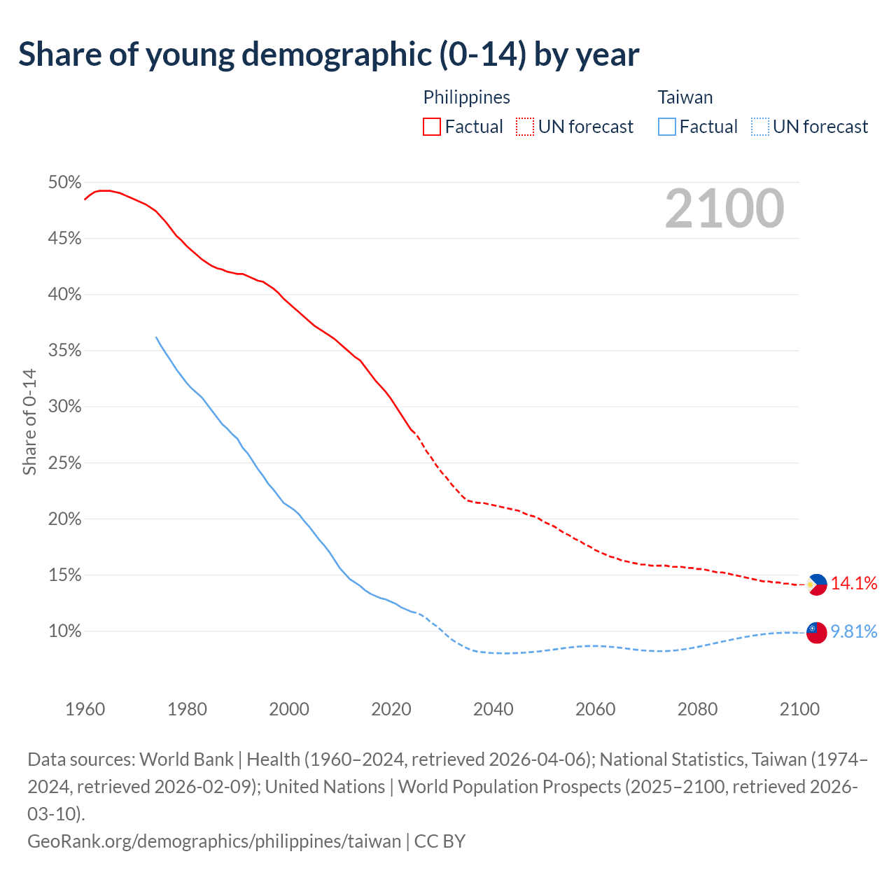 - The share of young demographic (0-15 years old) in the Philippines is 27.9% vs 11.7% in Taiwan.