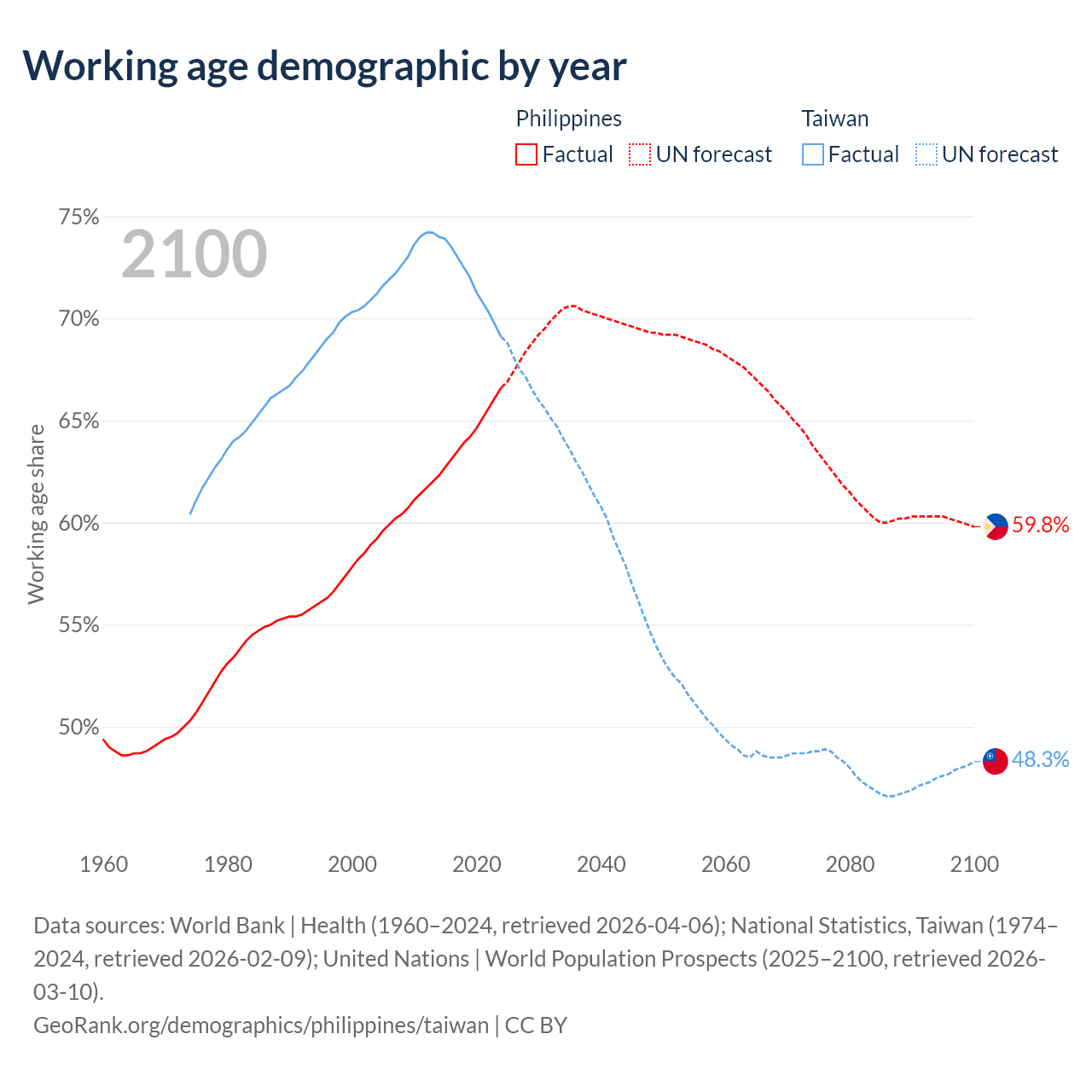 - The Philippines has 78.6M working age adults (aged 15-64) vs 16.1M in Taiwan.