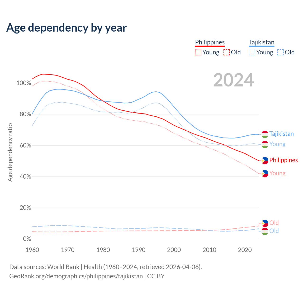 - The share of old-age demographic (65+) in the Philippines is 5.49% vs 3.85% in Tajikistan.