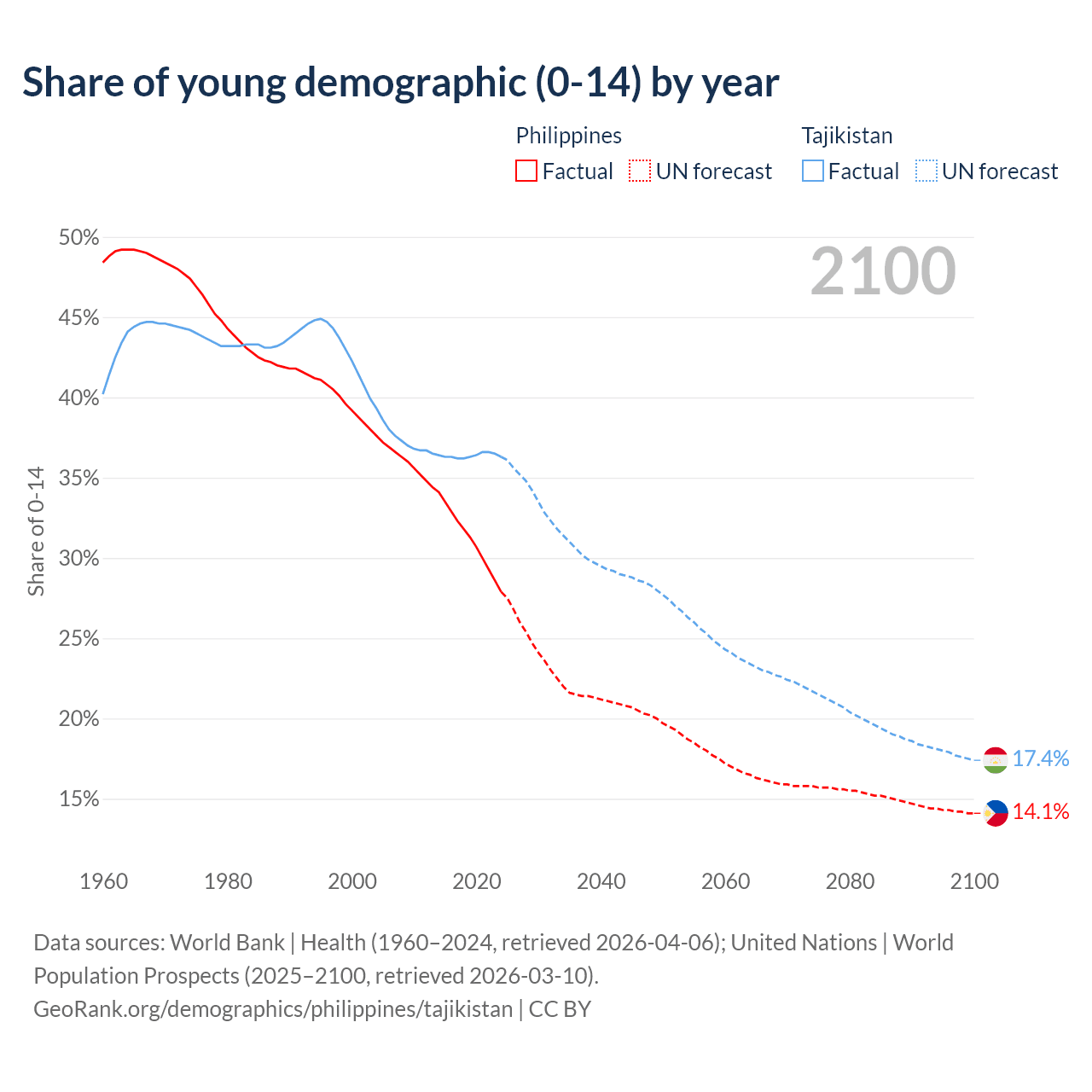 - The share of young demographic (0-15 years old) in the Philippines is 27.9% vs 36.3% in Tajikistan.