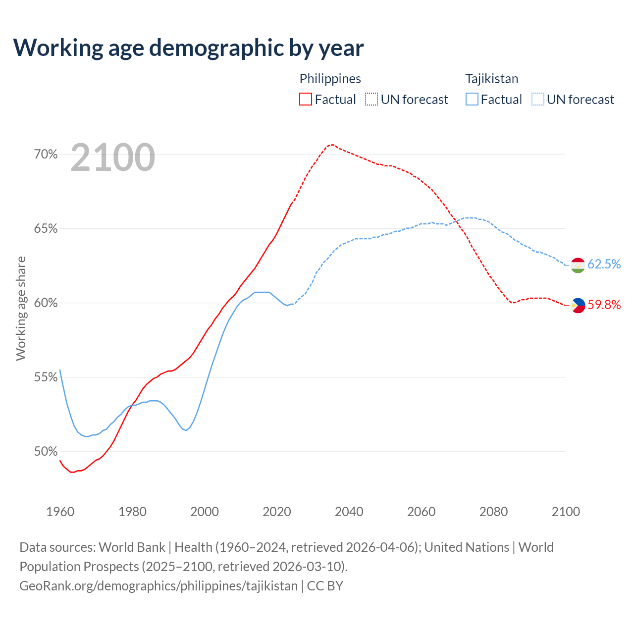 - The Philippines has 78.6M working age adults (aged 15-64) vs 6.61M in Tajikistan.