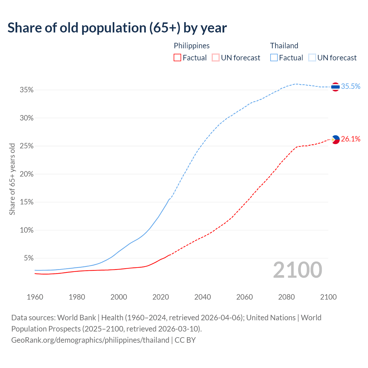 Median age Philippines vs Thailand, 1960-2100