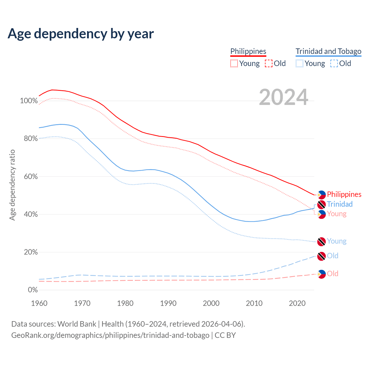 - The share of old-age demographic (65+) in the Philippines is 5.49% vs 12.4% in Trinidad and Tobago.