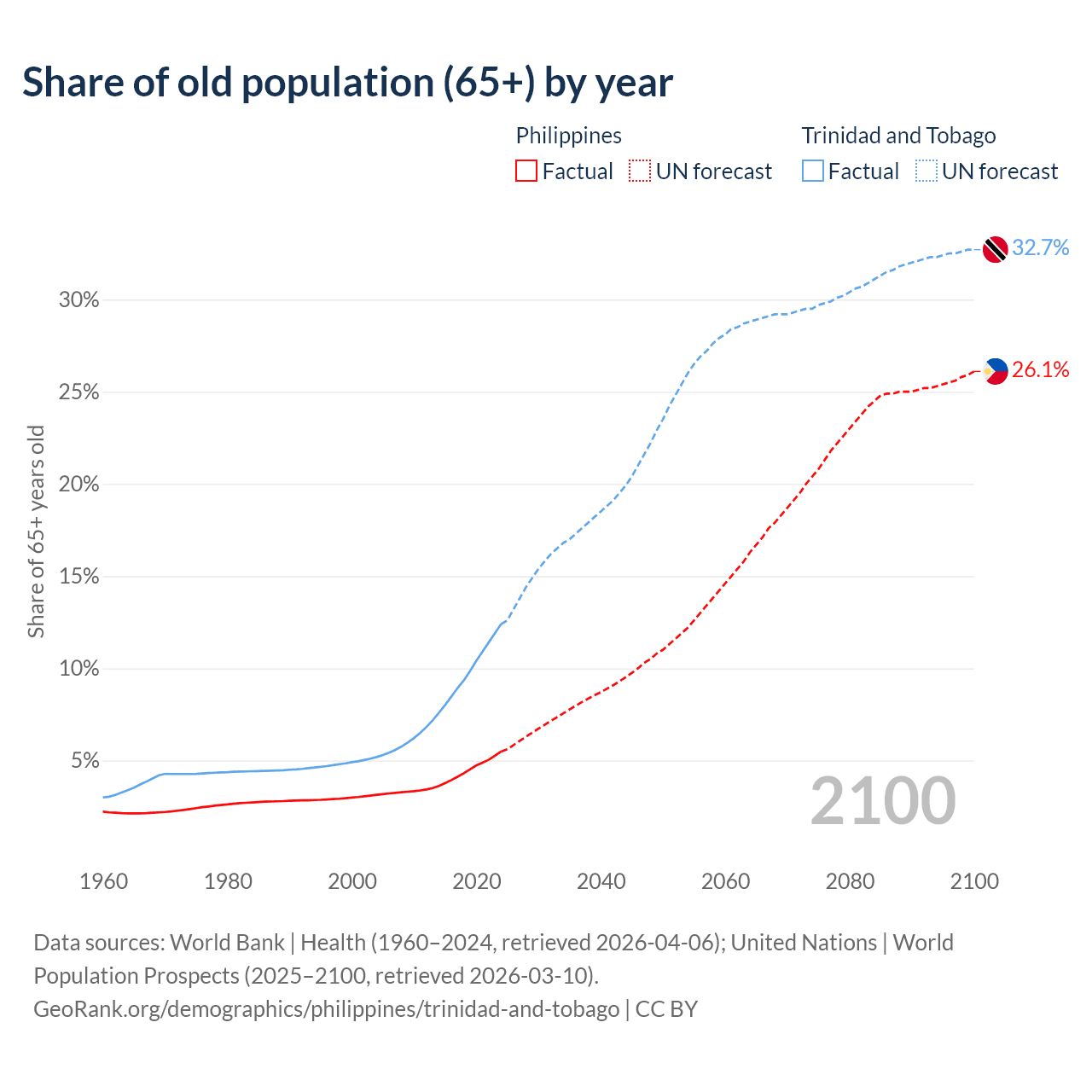 The share of older people aged 65 and over is 5.49% in the Philippines and 12.4% in Trinidad and Tobago. Life expectancy in the Philippines compared to Trinidad and Tobago .