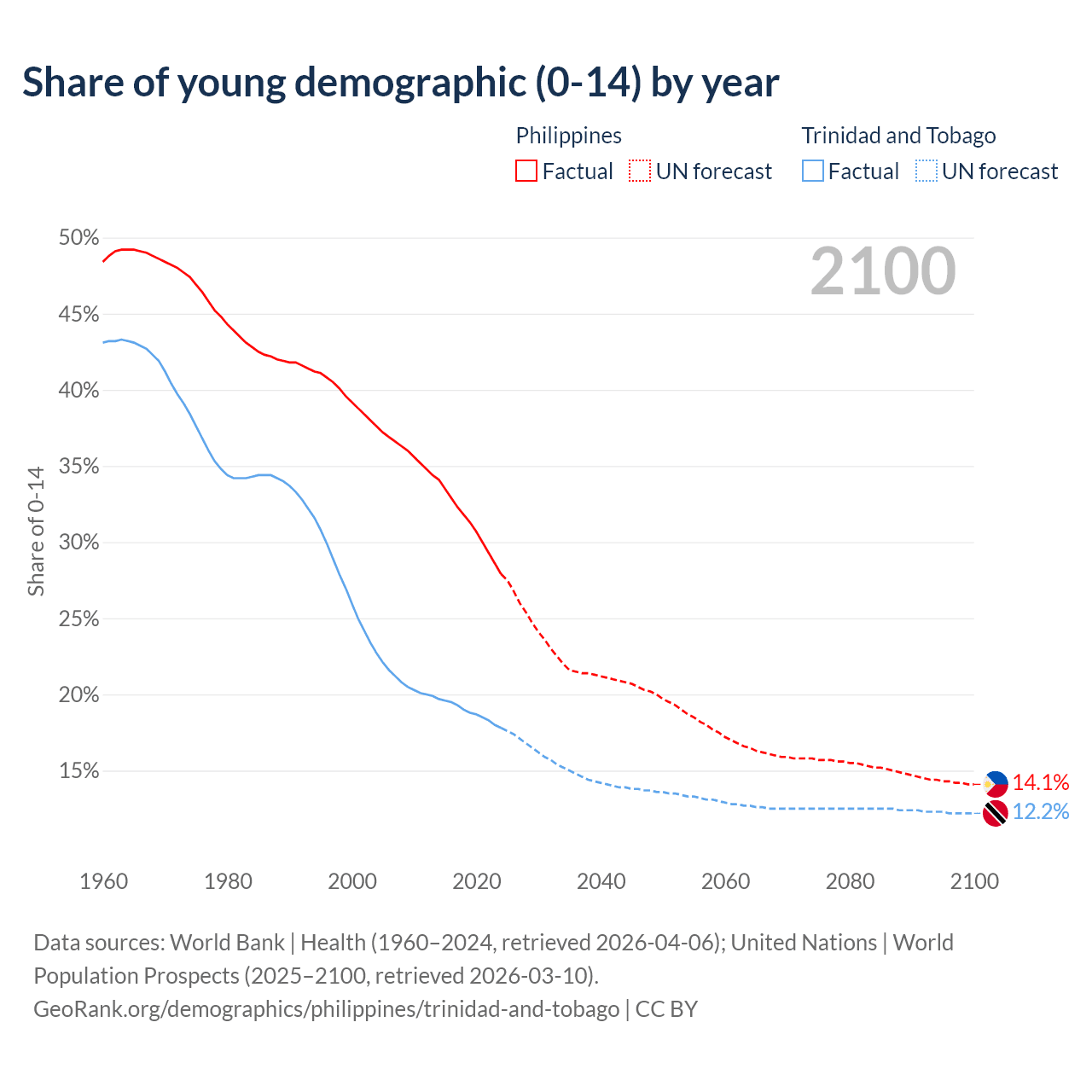- The share of young demographic (0-15 years old) in the Philippines is 27.9% vs 17.8% in Trinidad and Tobago.