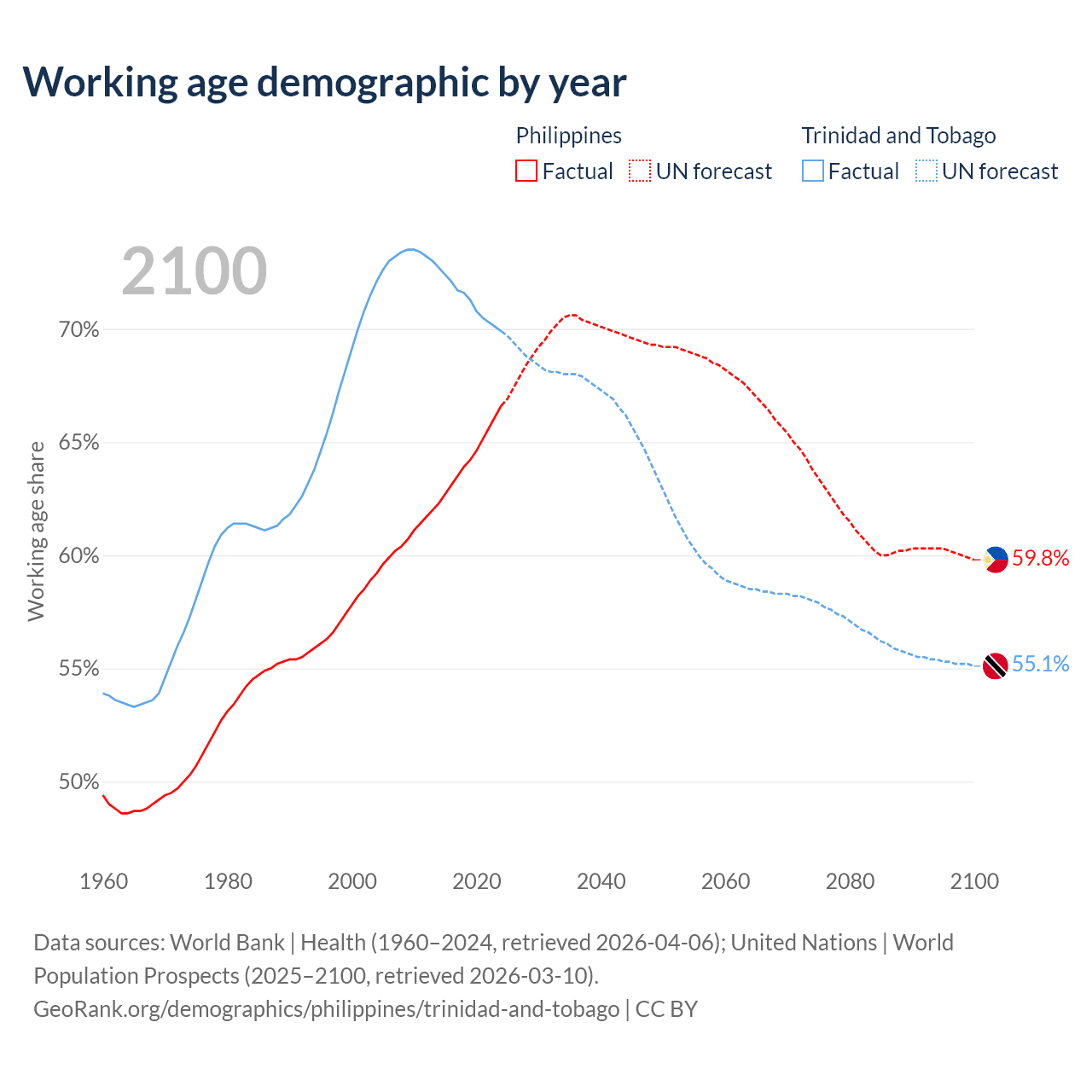 - The Philippines has 78.6M working age adults (aged 15-64) vs 960K in Trinidad and Tobago.