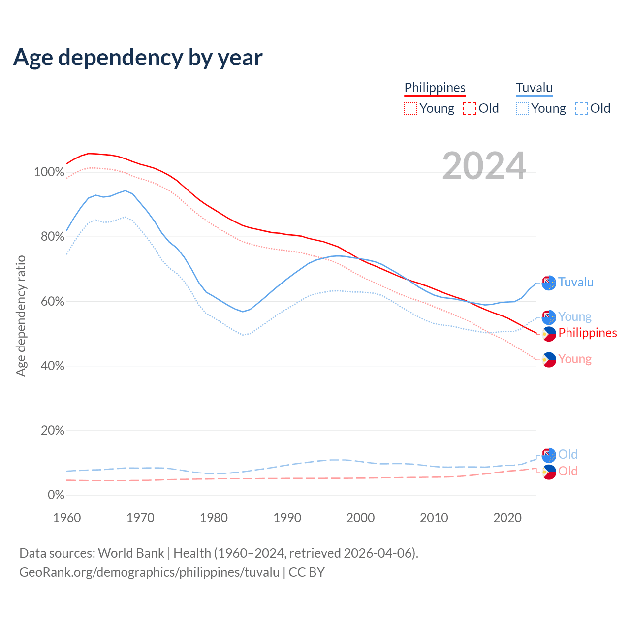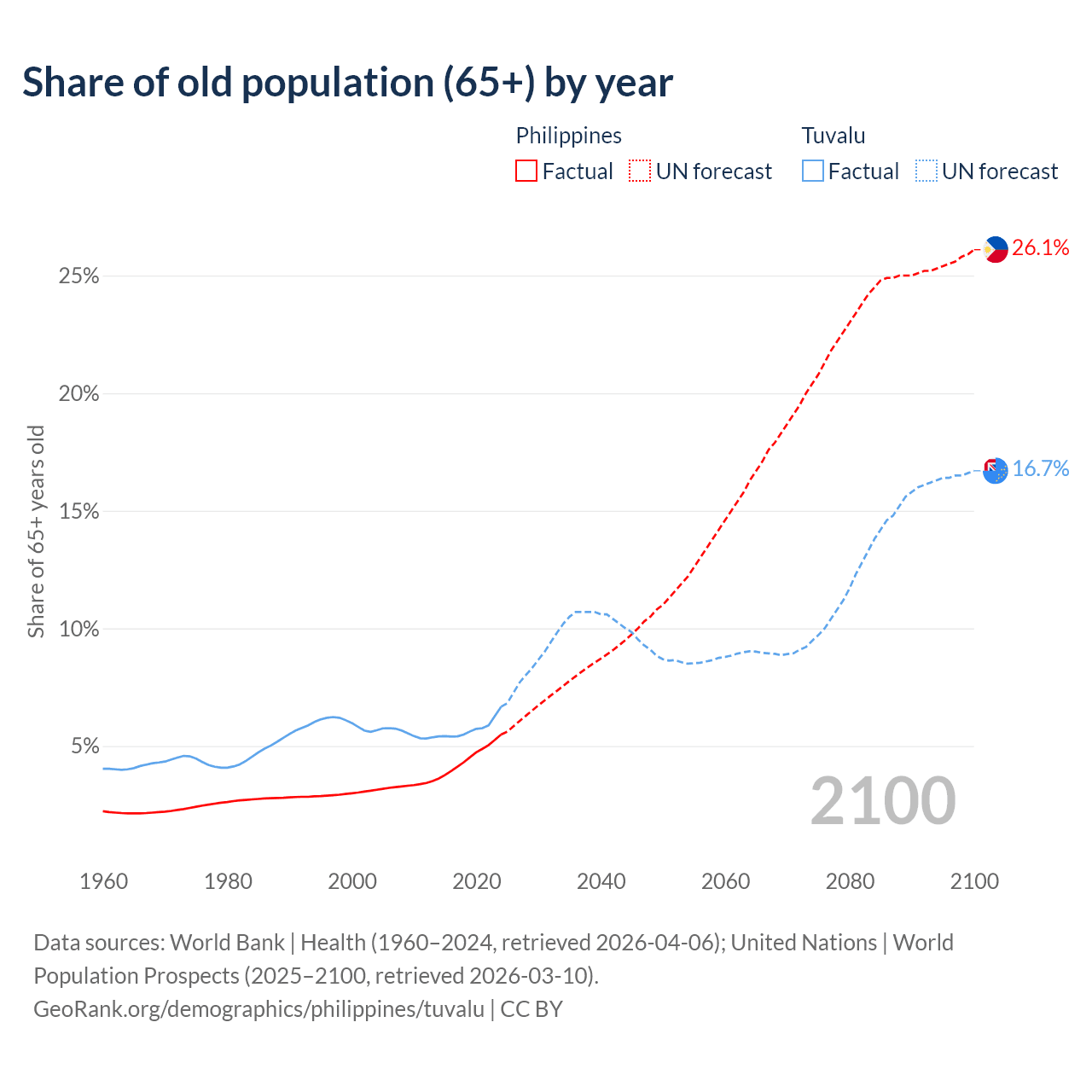 - The share of old-age demographic (65+) in the Philippines is 5.49% vs 6.67% in Tuvalu.