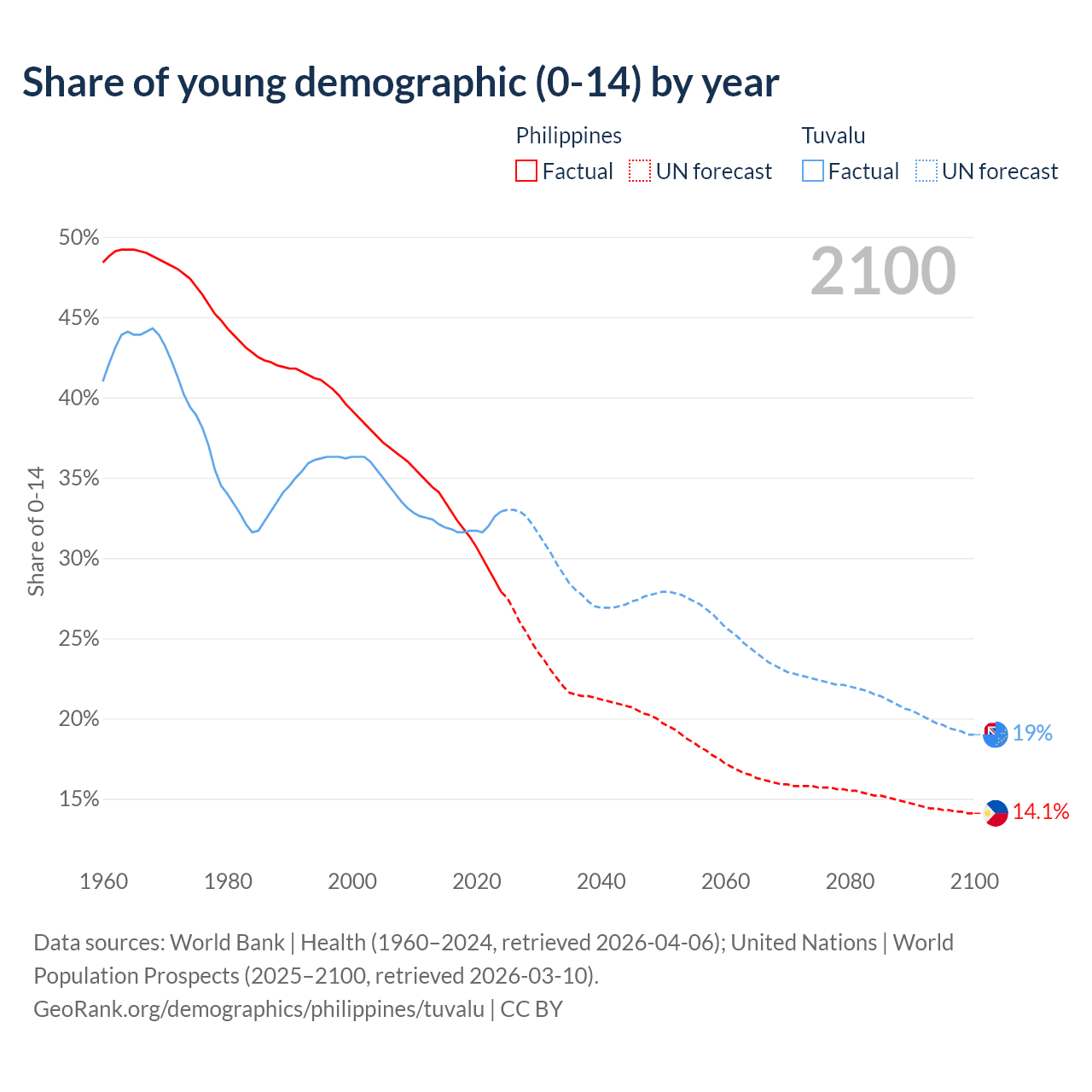 - The share of young demographic (0-15 years old) in the Philippines is 27.9% vs 32.9% in Tuvalu.