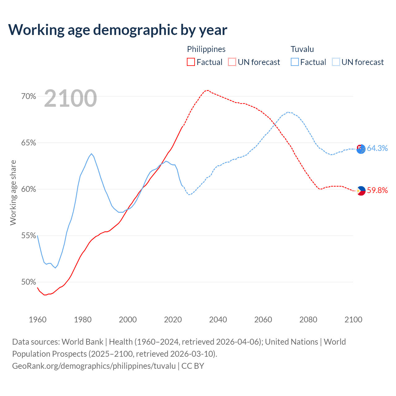 - The Philippines has 78.6M working age adults (aged 15-64) vs 5.64K in Tuvalu.