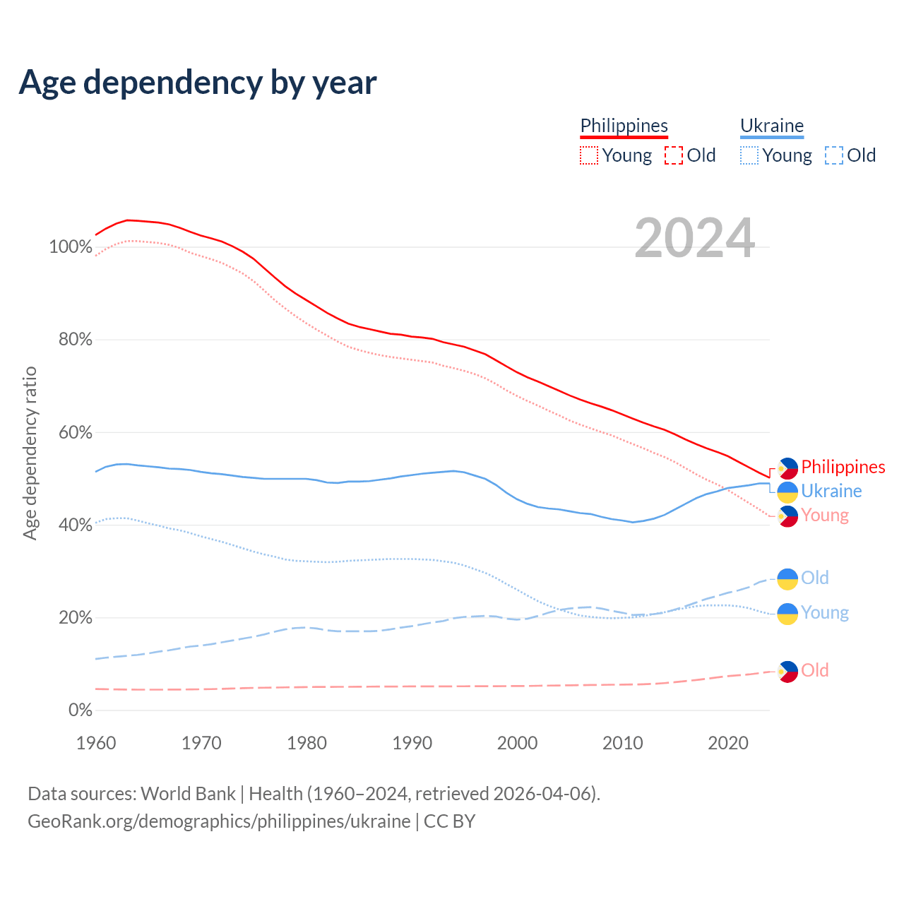 Data sources: World Bank | Health (1960–2024, retrieved 2026-04-06); U.S. Census Bureau (1960–2024, retrieved 2026-02-08).