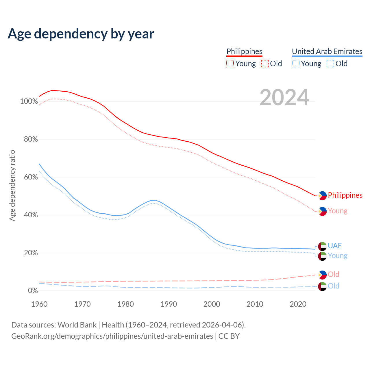 - The share of old-age demographic (65+) in the Philippines is 5.49% vs 1.77% in the United Arab Emirates.
