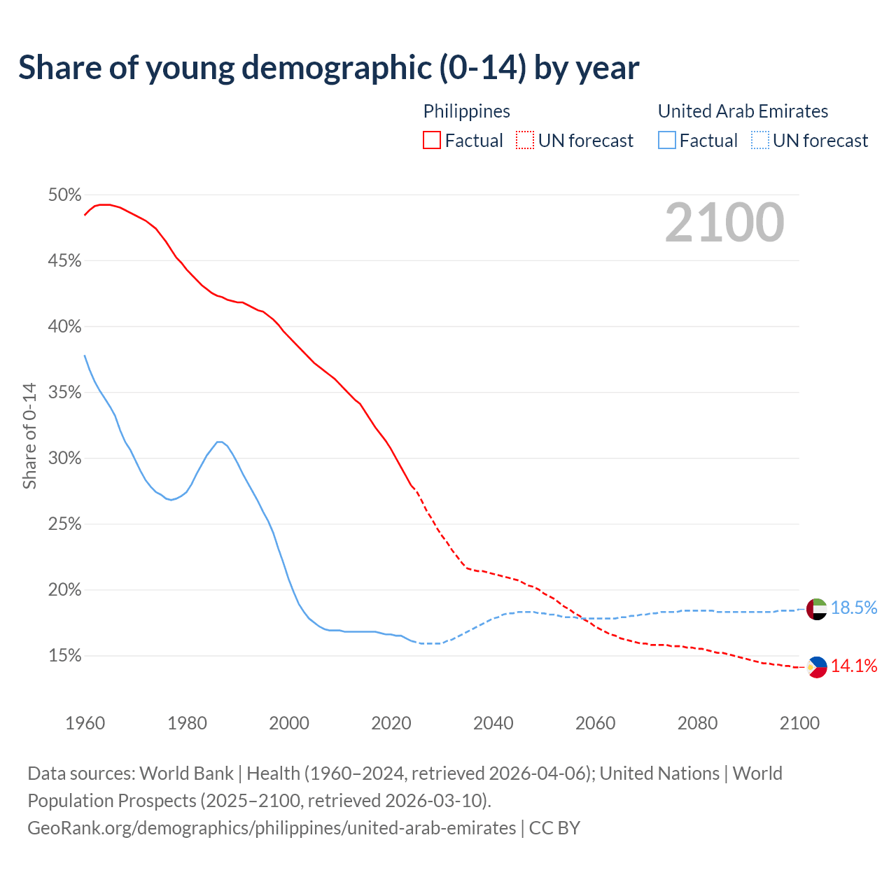 - The share of young demographic (0-15 years old) in the Philippines is 27.9% vs 16.1% in the United Arab Emirates.