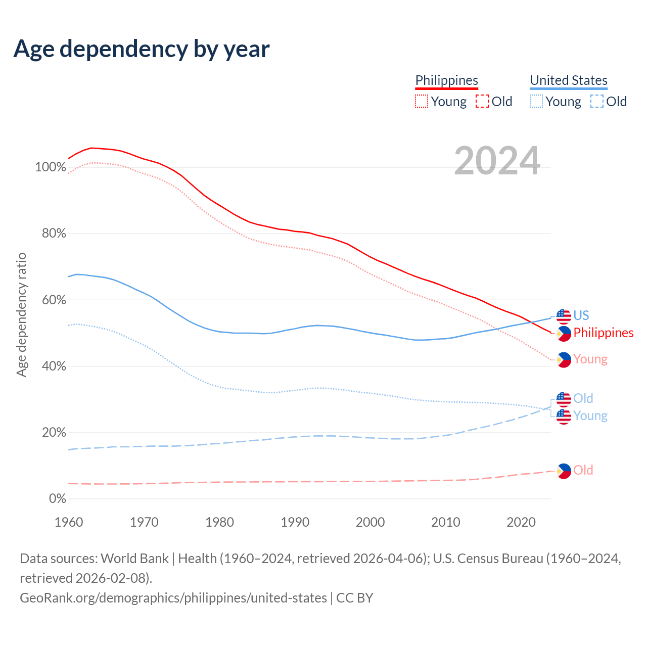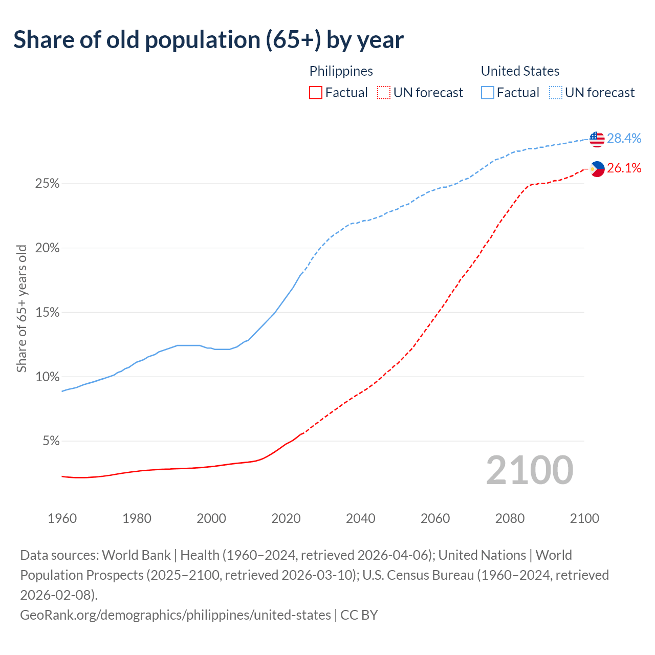 - The share of old-age demographic (65+) in the Philippines is 5.49% vs 17.9% in the United States.