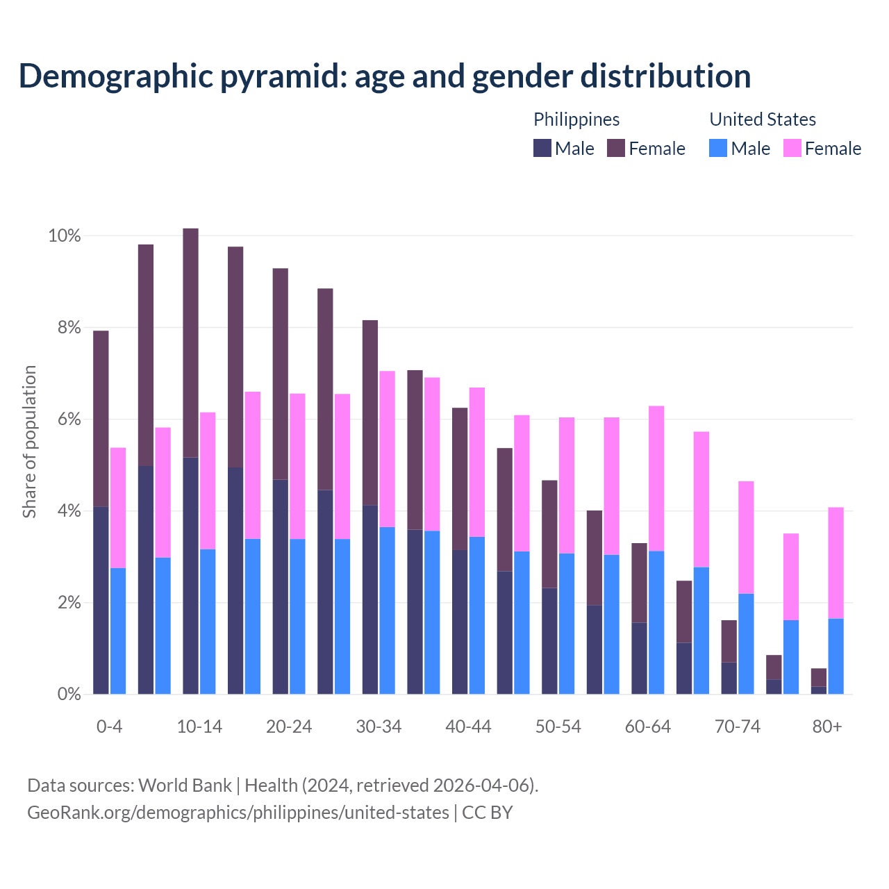 - The Philippines is ranked 123/196 by median age (oldest to youngest) vs 50/196 for the United States.