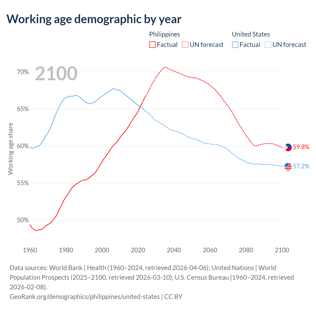 - The Philippines has 78.6M working age adults (aged 15-64) vs 223M in the United States.