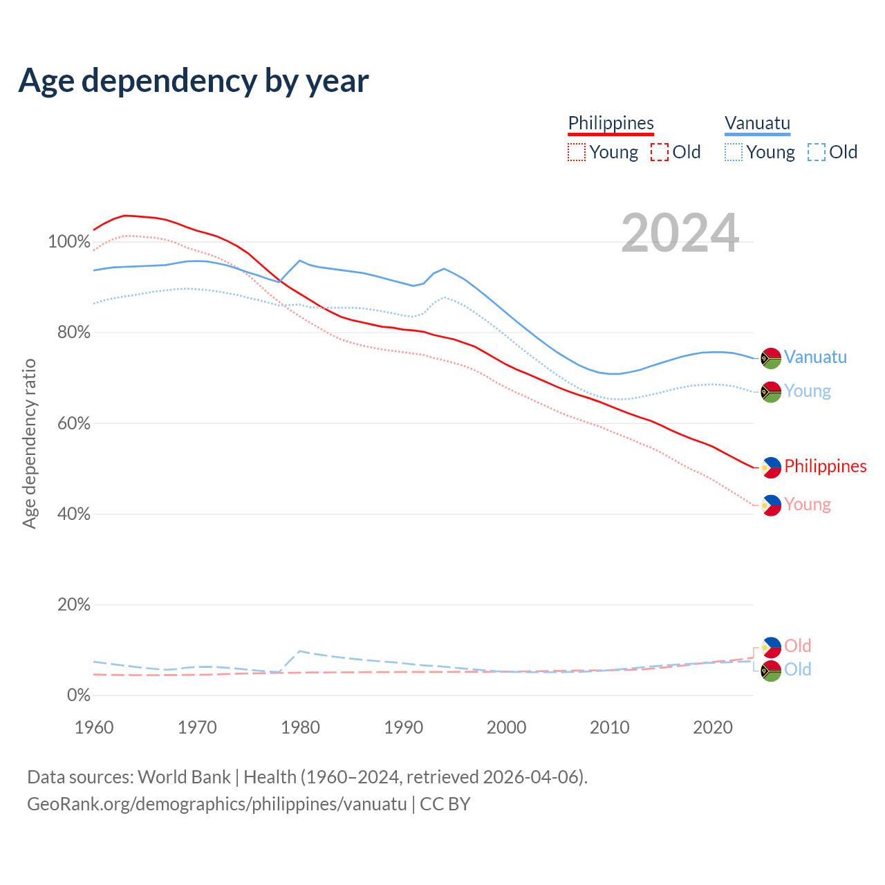 Data sources: World Bank | Health (1960–2024, retrieved 2026-04-06); U.S. Census Bureau (1960–2024, retrieved 2026-02-08).