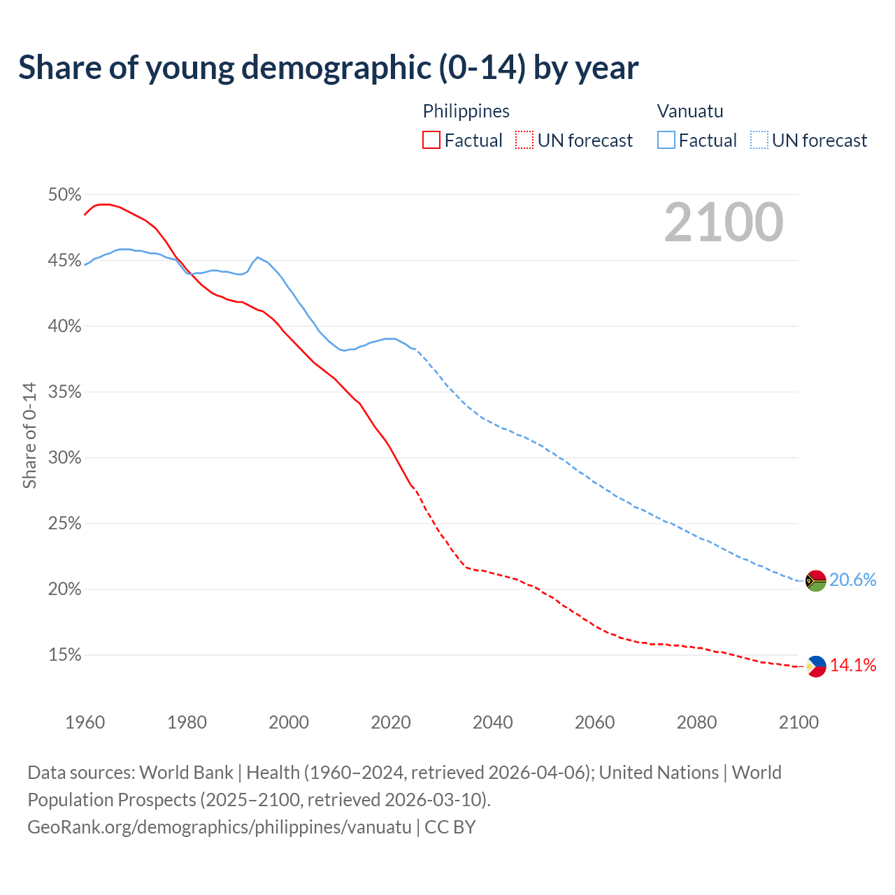 - The share of young demographic (0-15 years old) in the Philippines is 27.9% vs 38.3% in Vanuatu.