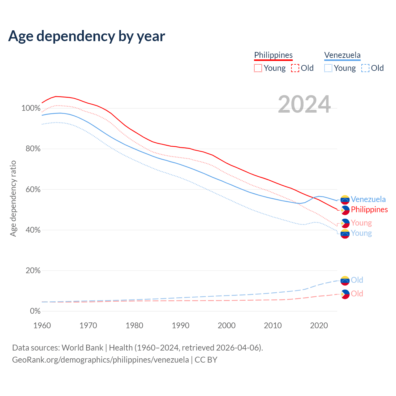 Data sources: World Bank | Health (1960–2024, retrieved 2026-04-06); U.S. Census Bureau (1960–2024, retrieved 2026-02-08).
