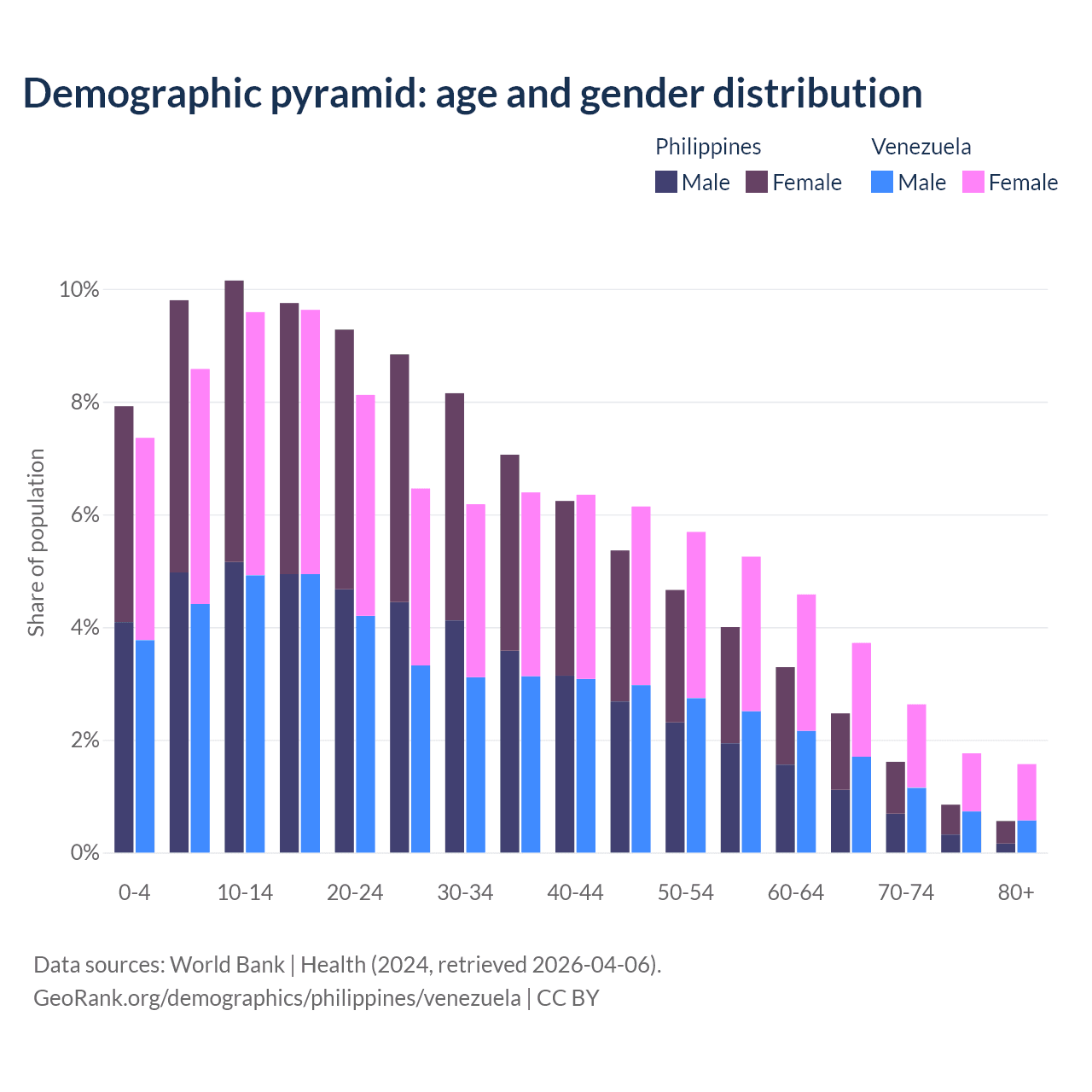 - The share of old-age demographic (65+) in the Philippines is 5.49% vs 9.68% in Venezuela.