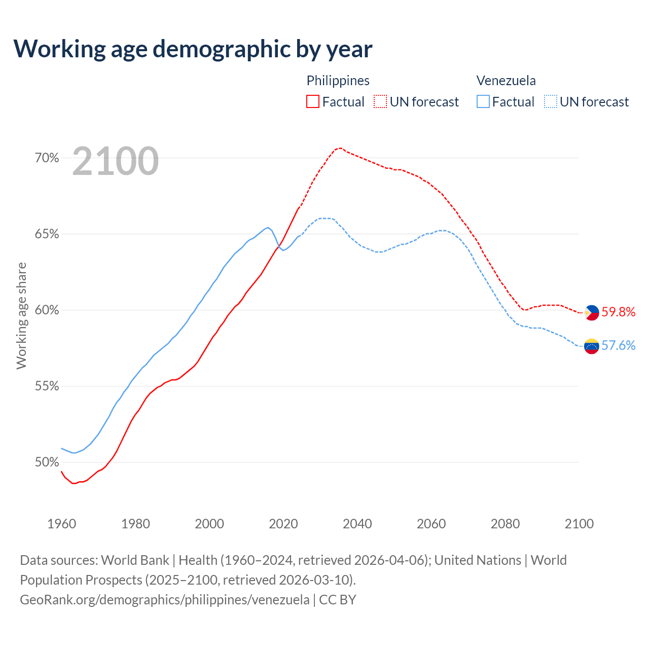 Median age Philippines vs Venezuela, 1960-2100