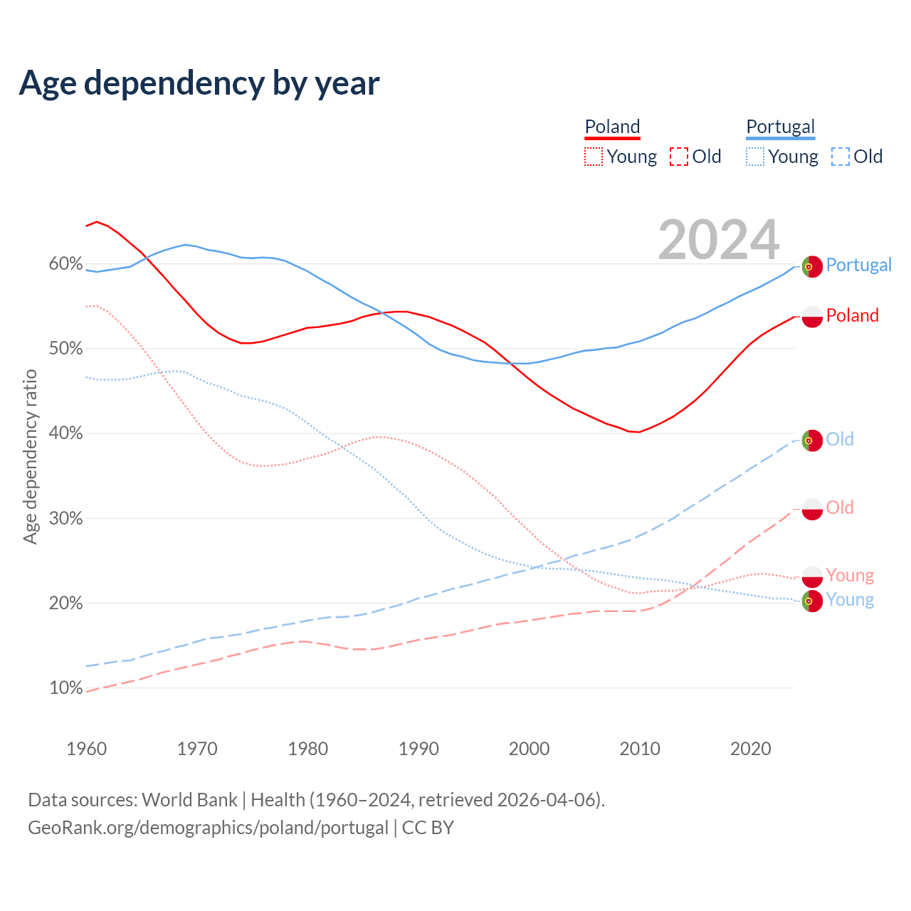 - Poland is ranked 30/196 by median age (oldest to youngest) vs 5/196 for Portugal.