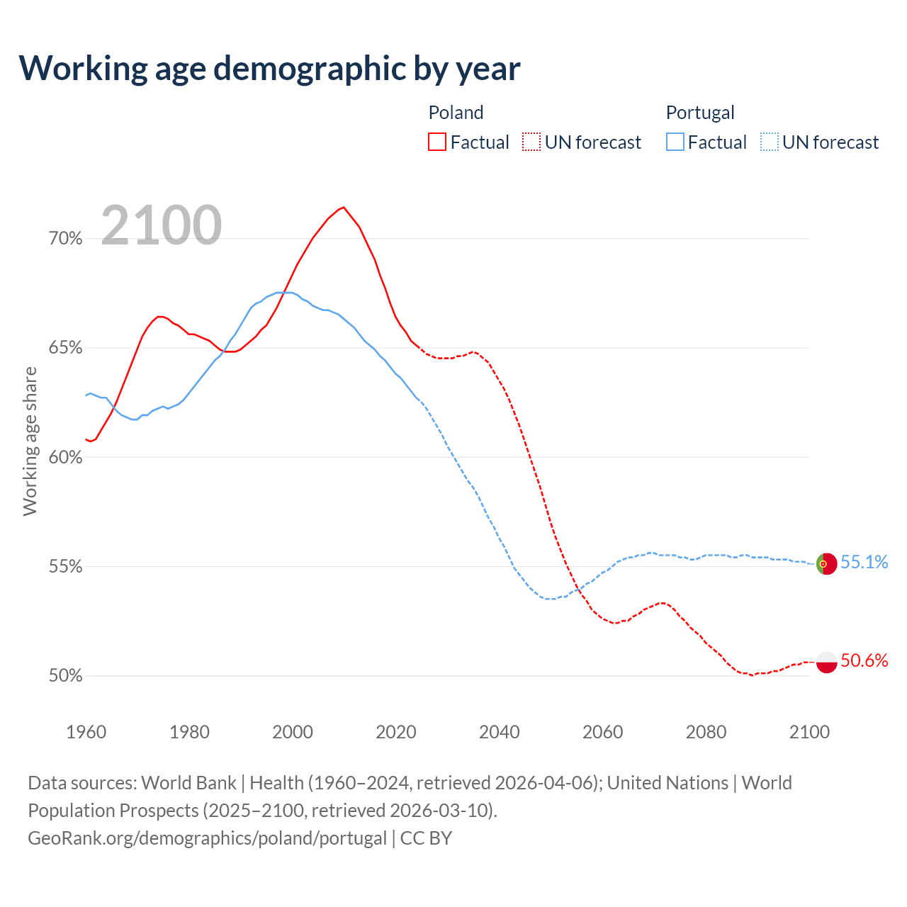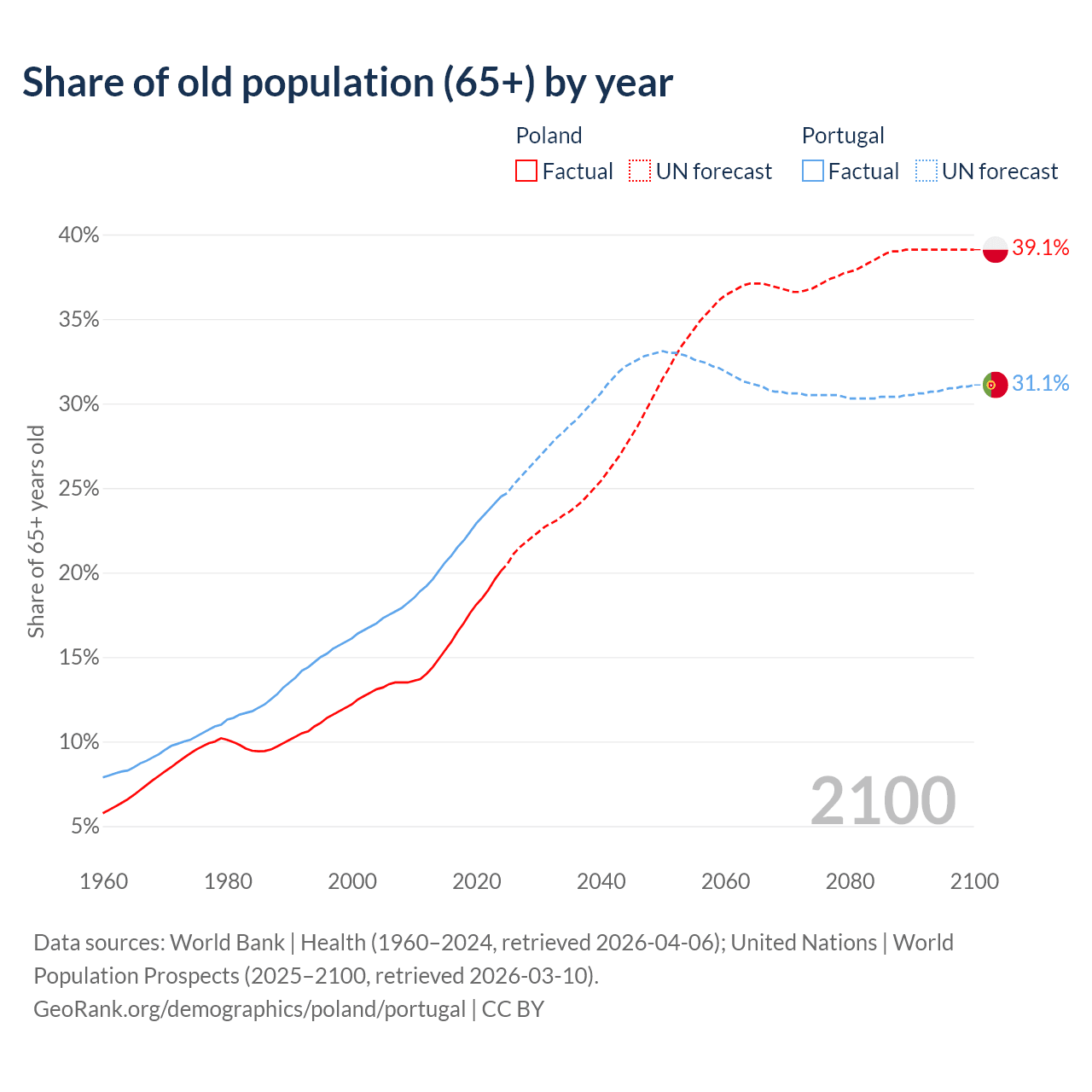 Median age Poland vs Portugal, 1960-2100